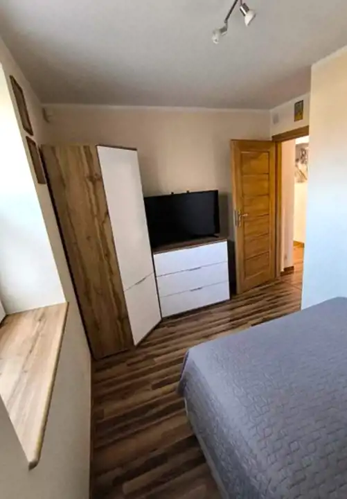 Przestronna sypialnia - z dużym wygodnym łożem małżeńskim , nowoczesna , widna .
