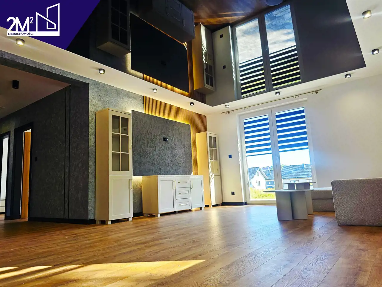 Salon – przestronny, jasny, z wyjściem na duży taras. Na ścianie glinka wenecka połączona z lamelami, na podłodze wysokiej jakości panele.