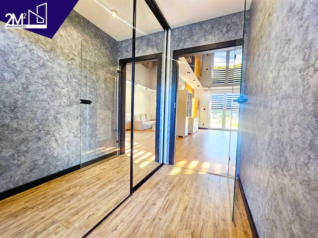 Przedpokój – wejście przez przeszklone drzwi. Na podłodze płytki drewnopodobne ułożone w klasyczny wzór. Szafa z lustrami, która daje nam dodatkową przestrzeń oraz estetykę pomieszczenia.