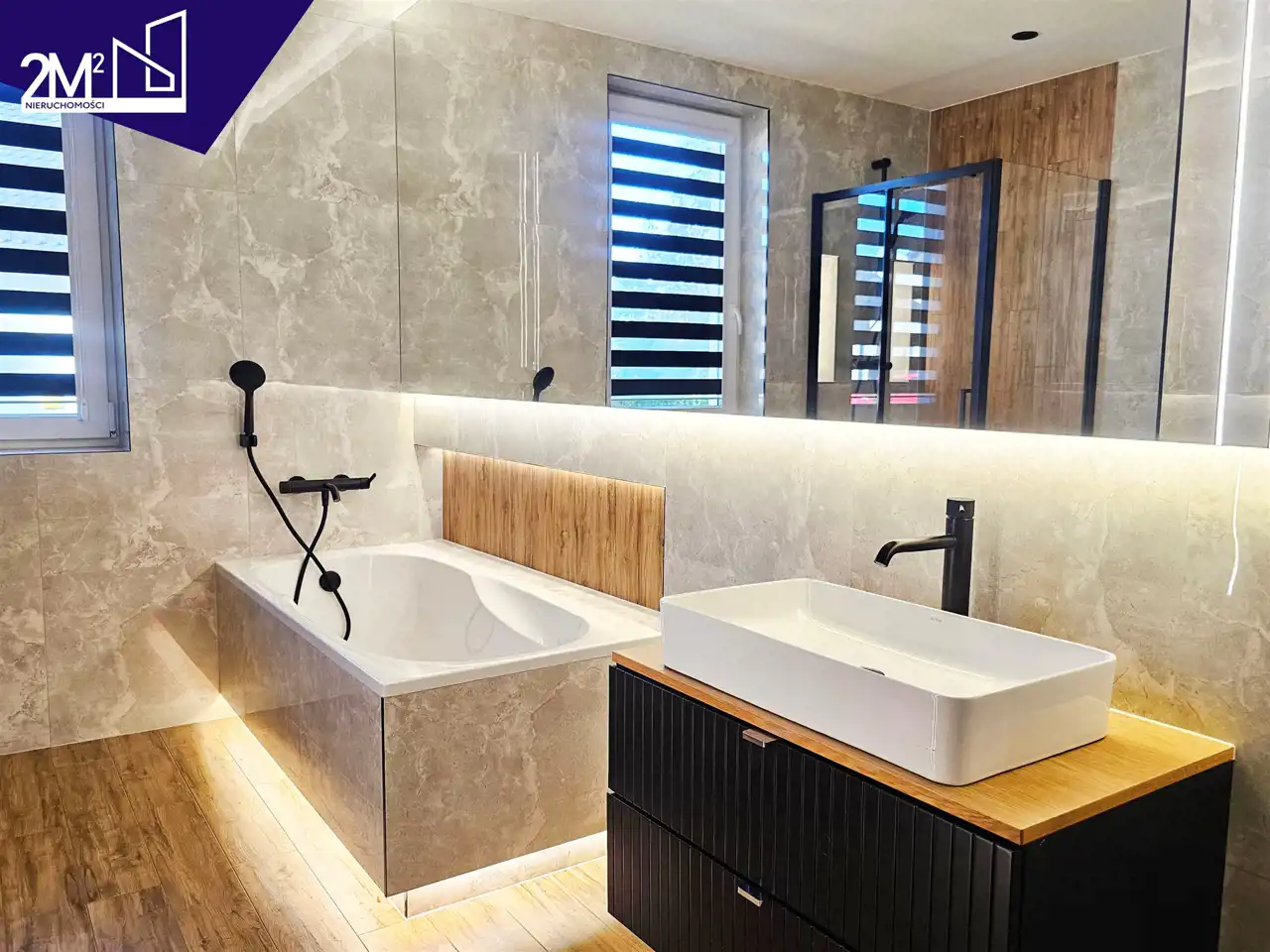 Łazienka – wanna, prysznic, czarna armatura oraz designerskie lustro na całości ściany z wbudowanym ledem.
