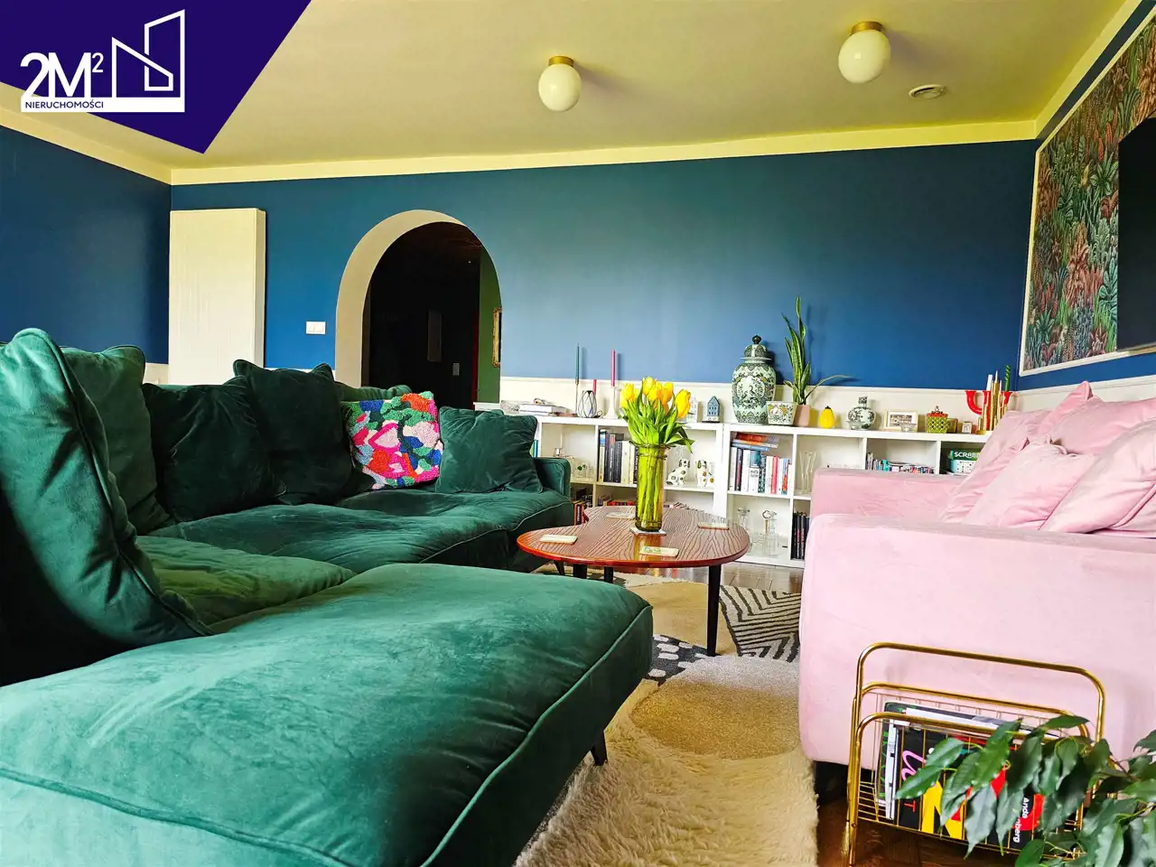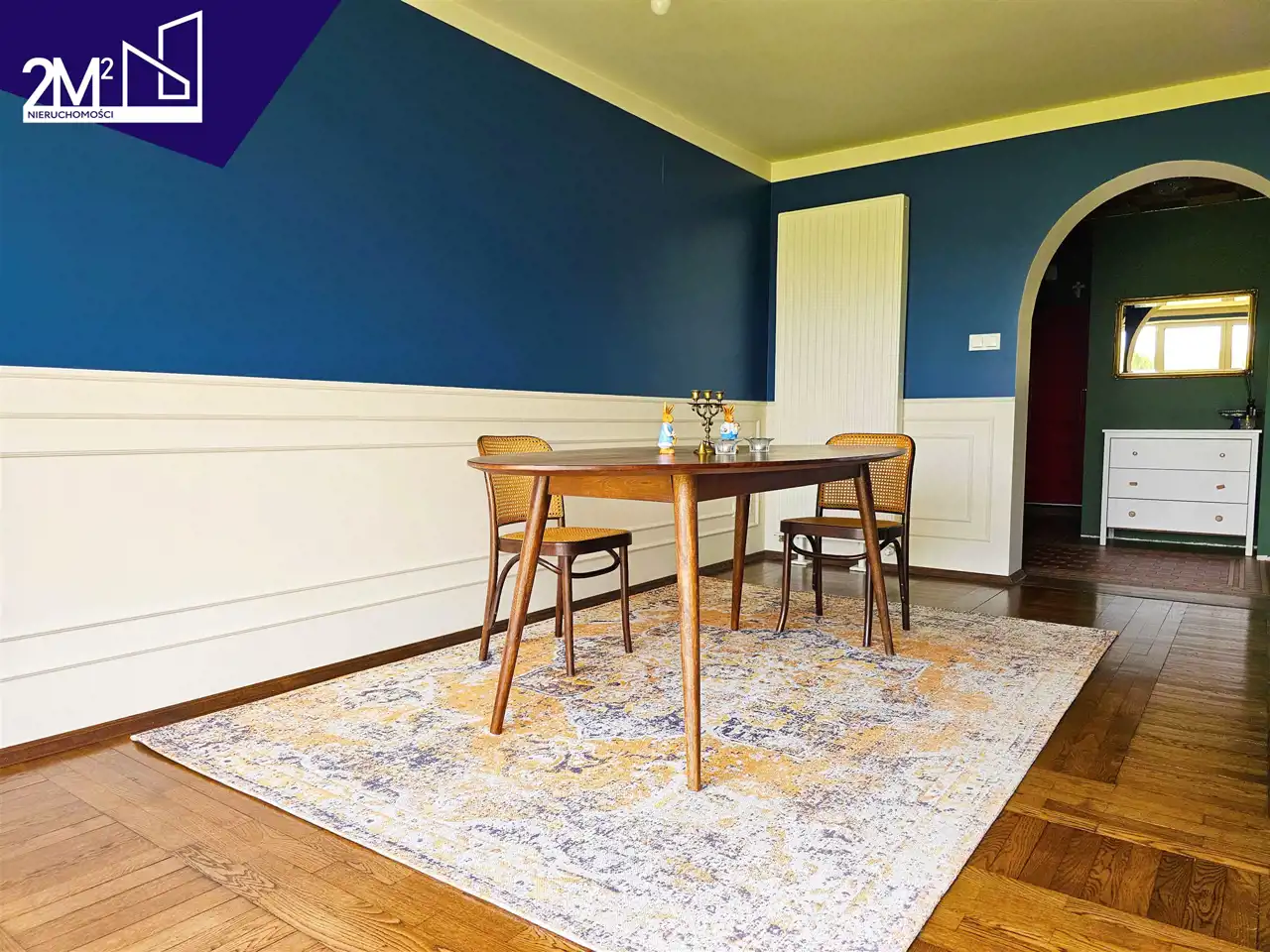 Salon – przestronny, jasny, z biało-niebieskimi ścianami, sztukaterią i dużymi oknami z widokiem na ogród. Na ścianie tapeta marki Cole & Son, na podłodze dębowy parkiet oraz dwa ręcznie wykonane dywany (wełna z wiskozą i bawełną).