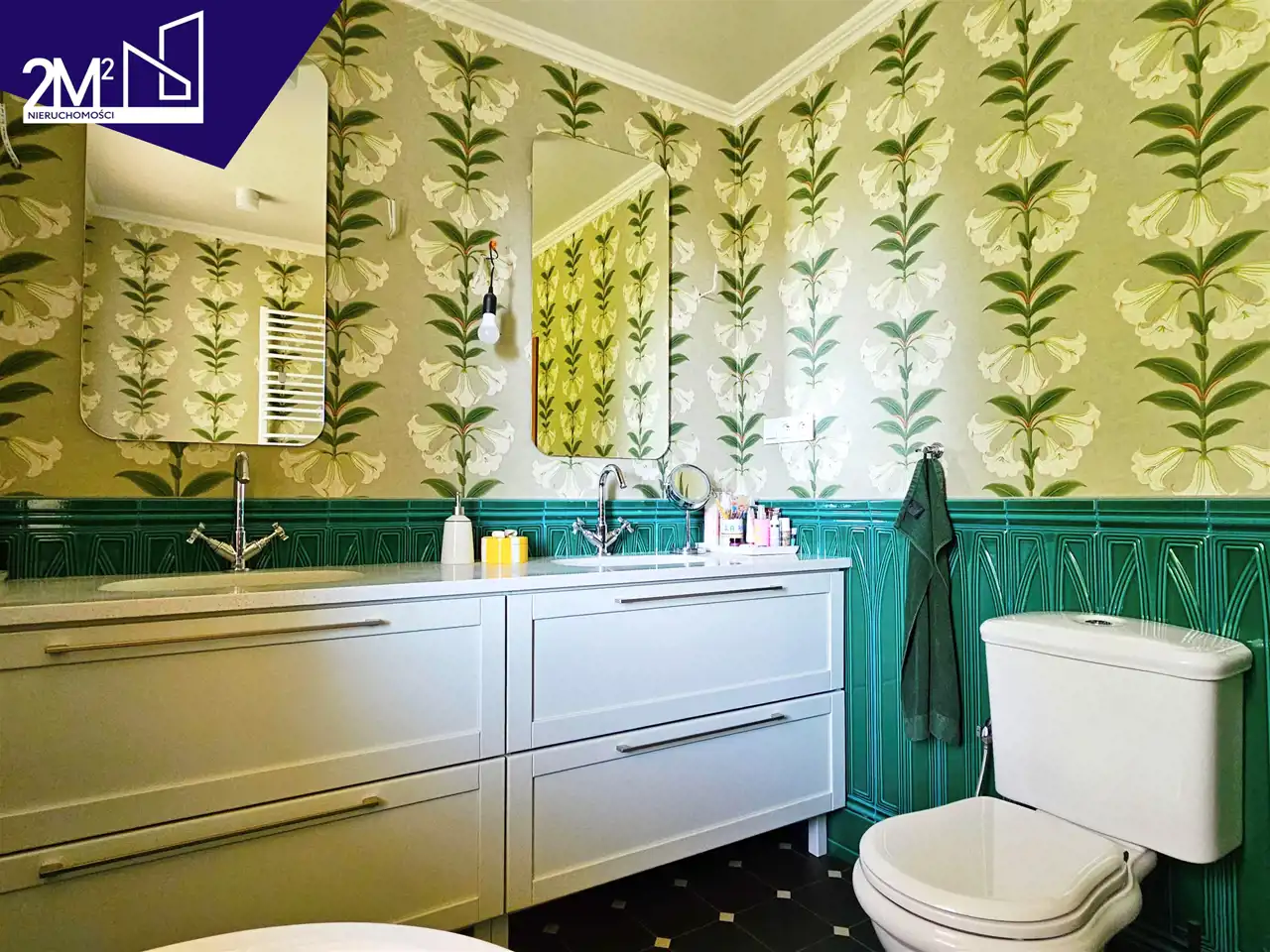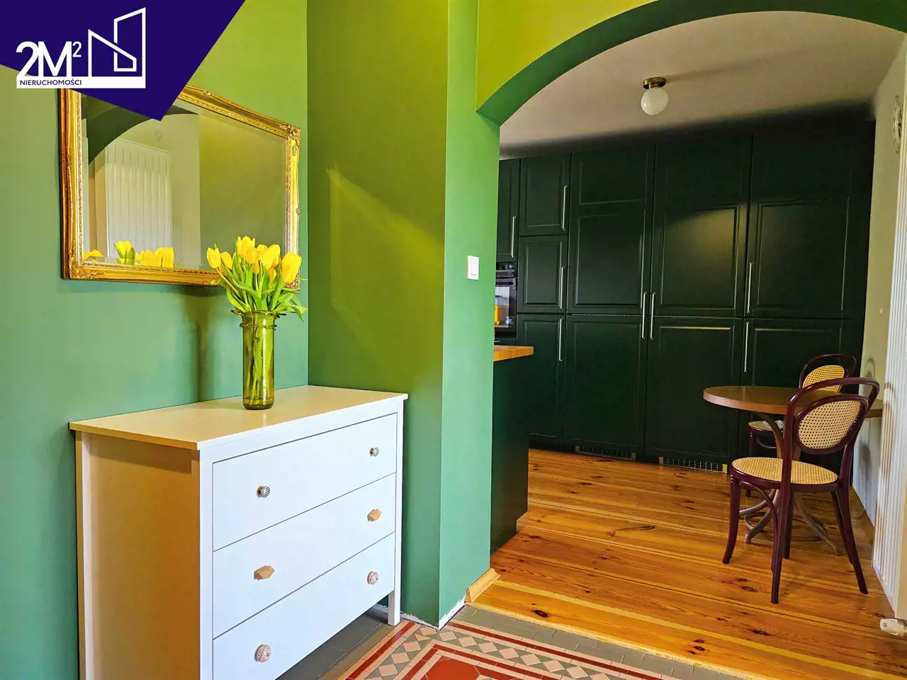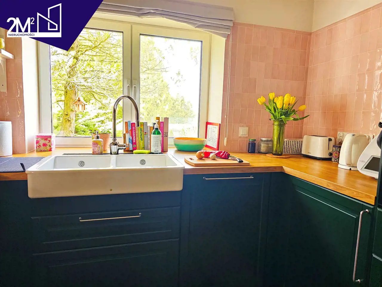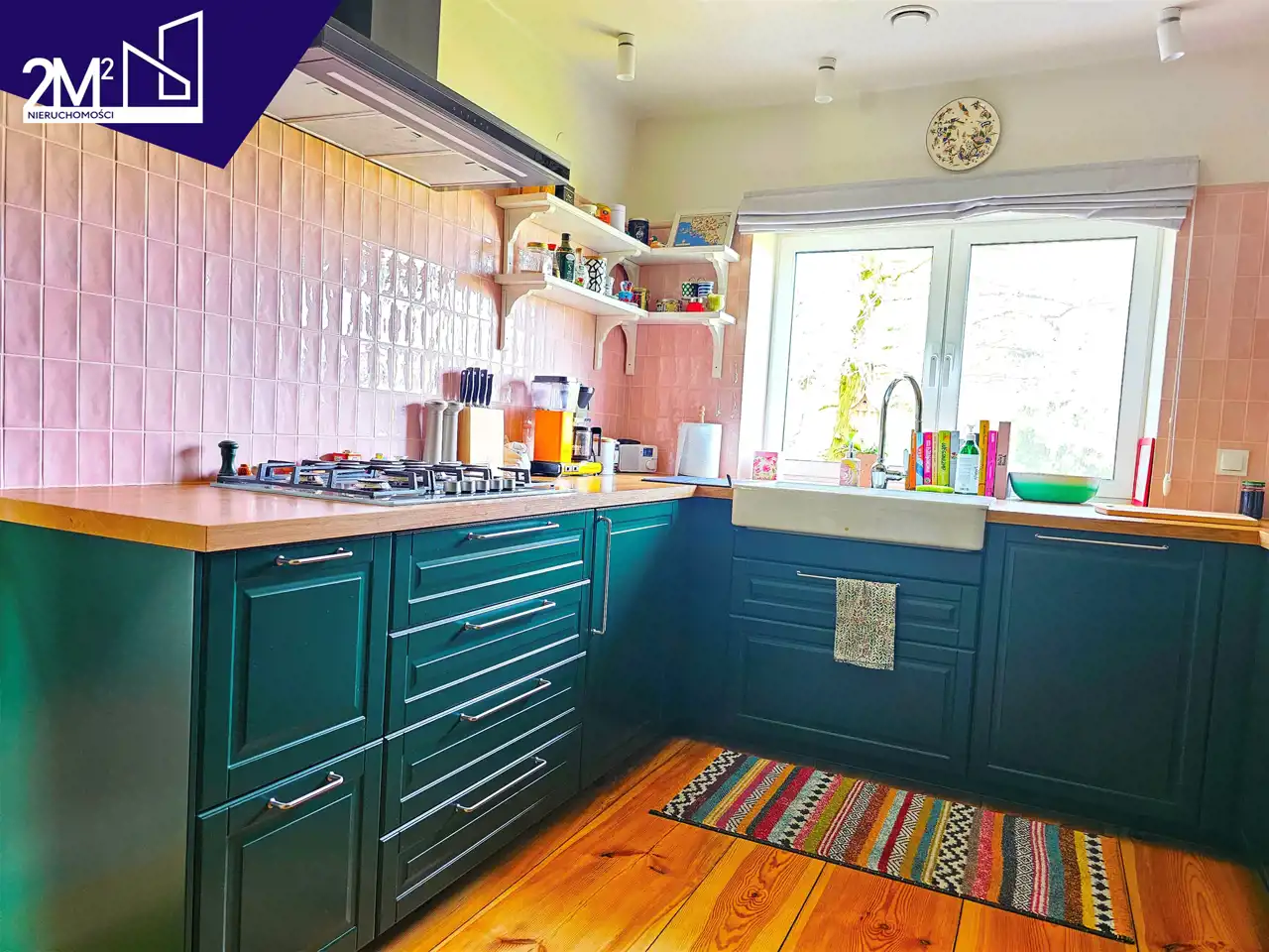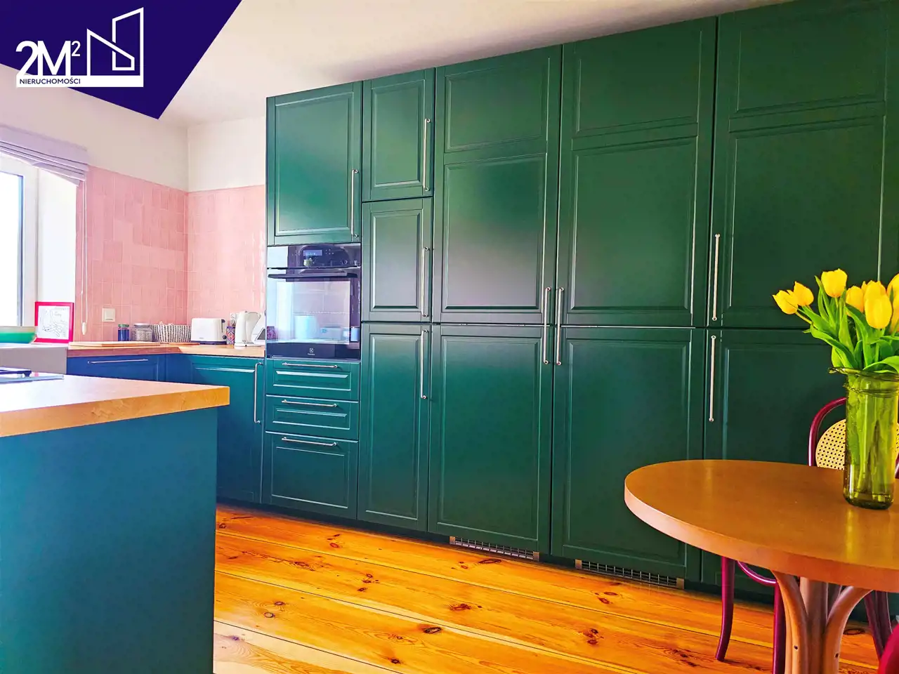 Kuchnia – klasyczna zabudowa IKEA (25 lat gwarancji), fronty w kolorze butelkowej zieleni. Sprzęt AGD marki Electrolux (na gwarancji), ceramiczny biały zlew, hiszpańskie różowe kafle, okap Elica, duża lodówka i zamrażarka w zabudowie.