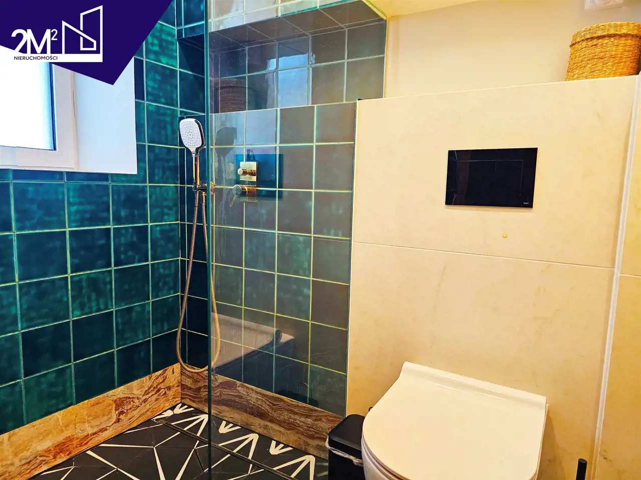 Łazienka – prysznic typu walk-in z indywidualnie projektowaną szybą i odpływem liniowym Viega. Zielone kafle z polskiej manufaktury KAFLOVE, złota armatura HushLab, designerskie lustro i kinkiet firmy Zangra.