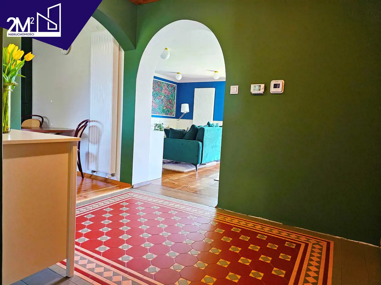 Przedpokój – wejście przez drzwi w angielskim stylu, w intensywnym czerwonym kolorze. Na podłodze płytki marki Original Style, ułożone w klasyczny wzór. Drewniany sufit i kryształowe oświetlenie dopełniają elegancji.