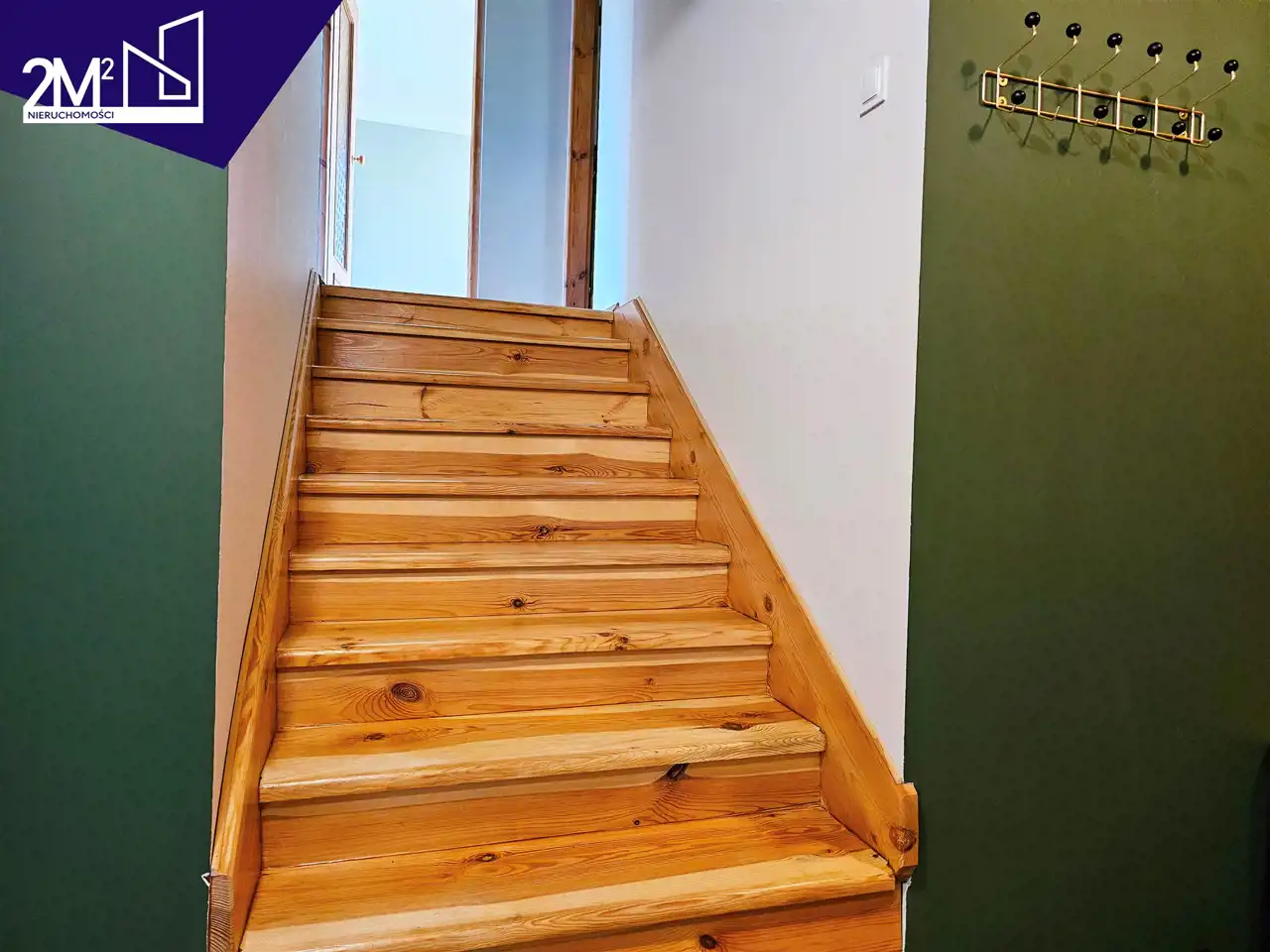 Klatka schodowa – schody sosnowe, zielony drewniany sufit i kryształowe kinkiety