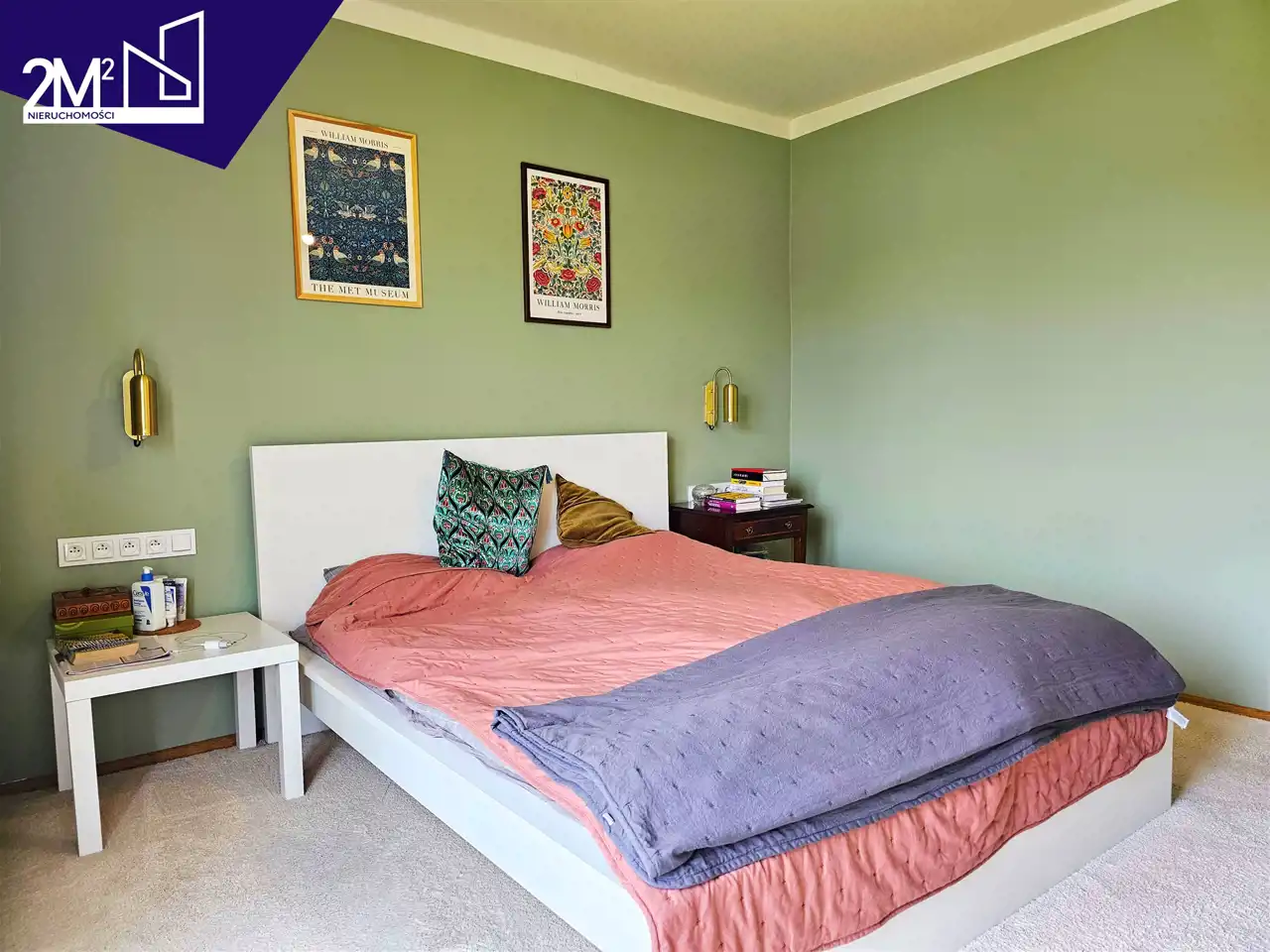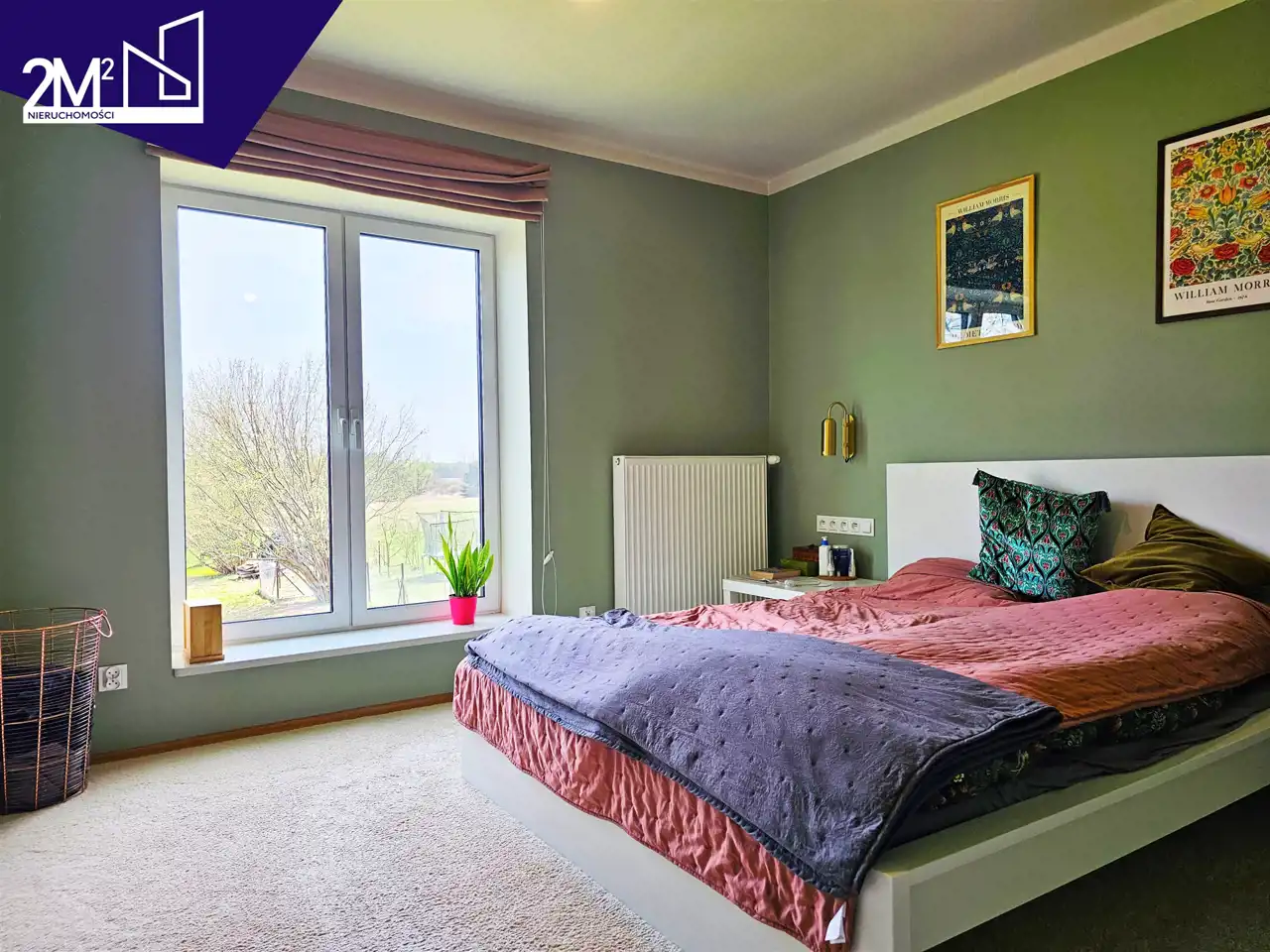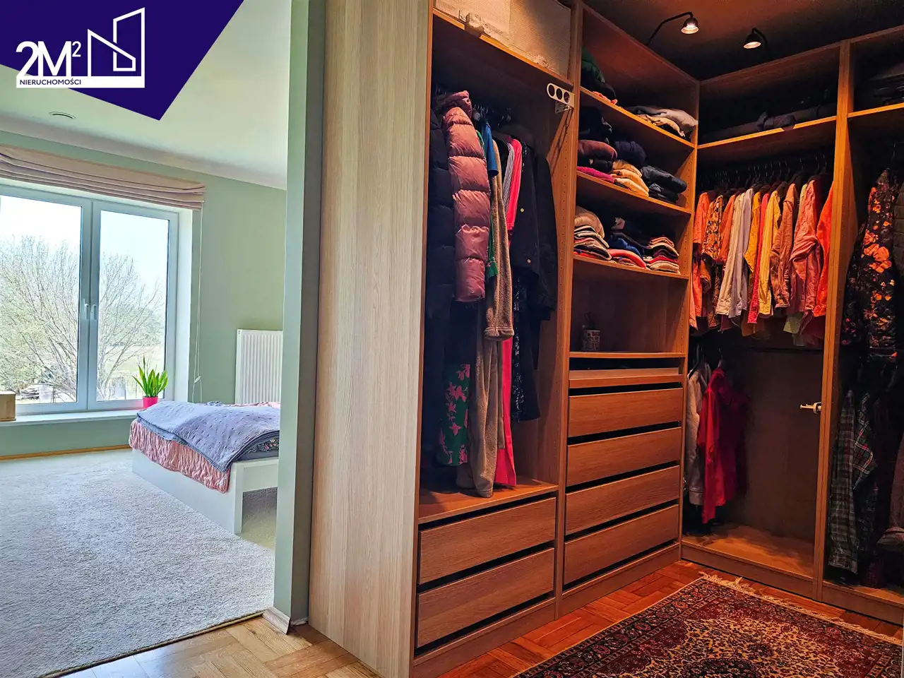 Sypialnia główna – przytulna, w tonacji zieleni, z podświetlaną garderobą IKEA i wykładziną w części sypialnianej. Roleta rzymska zaciemniająca.