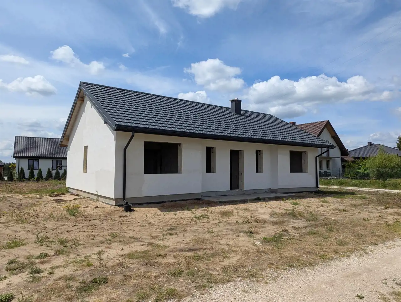 Wolno stojący dom parterowy o powierzchni całkowitej 89,99 mkw, położony w Kucerzu, gmina Lubanie, na wzniesieniu, z widokiem na Wisłę, w osiedlu nowych domów i wielu wydzielonych pod budowę domów działek, w stanie surowym otwartym.