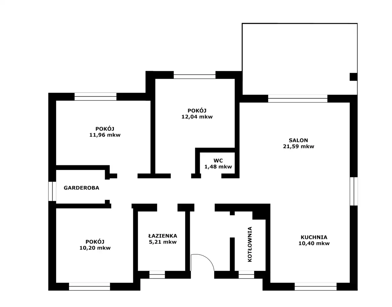 Bardzo funkcjonalny, uniwersalny rozkład: salon 21,59 mkw, z wyjściem na duży taras (już wylany), połączony z jadalnią i kuchnią 10,40 mkw, 3 pokoje – 12,04 mkw, 11,96 mkw i 10,20 mkw, garderoba, łazienka 5,21 mkw, WC 1,48 mkw, kotłownia, przedpokój i wiatrołap.