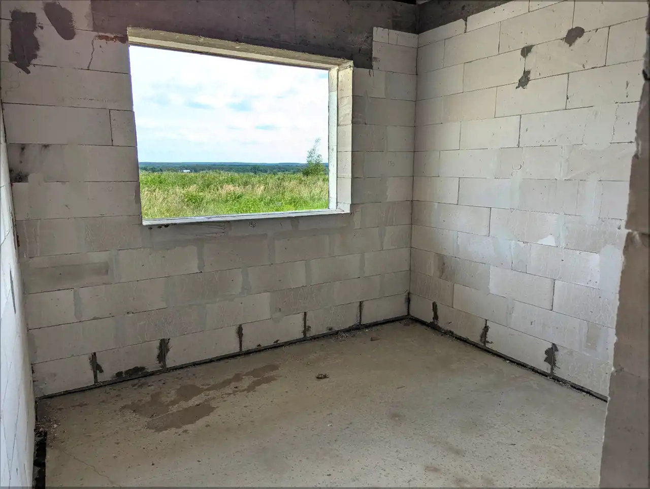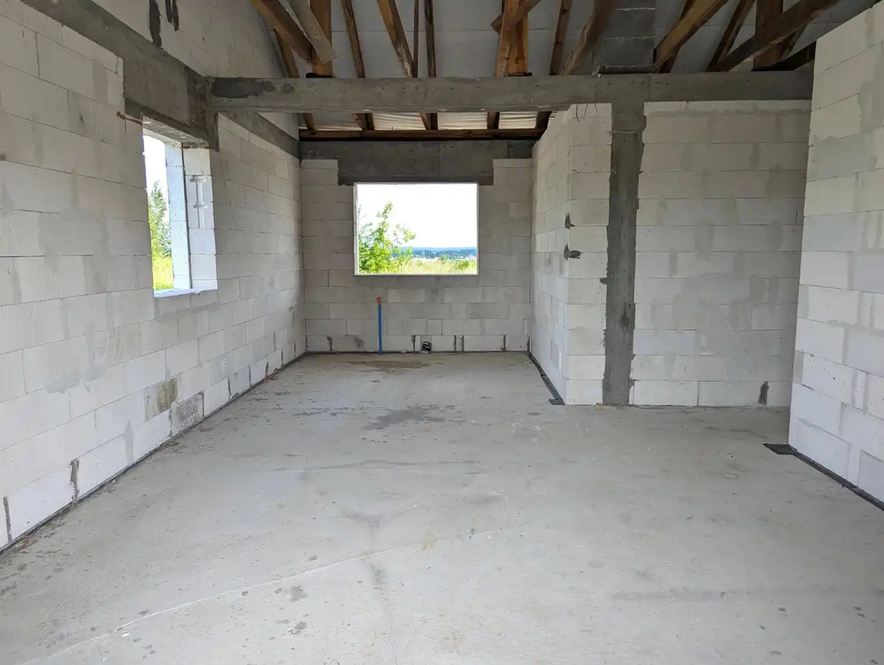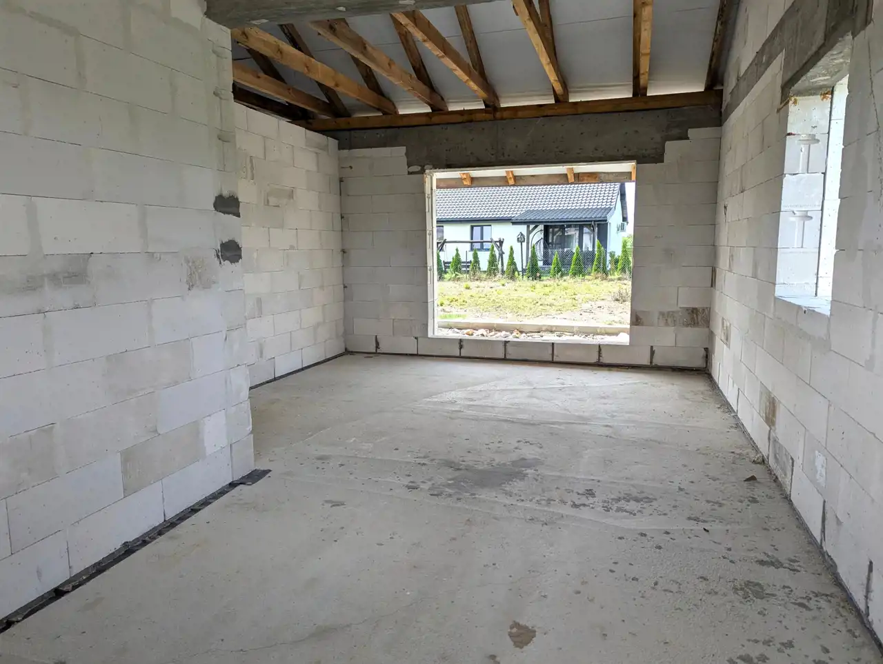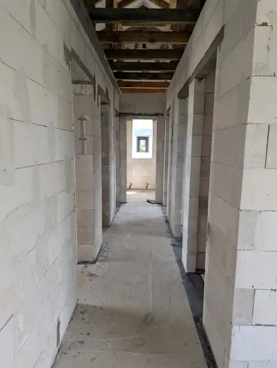 Wybudowany z siporexu (24 cm), ocieplony styropianem (15 cm), łącznie z fundamentami, z dachem 2-spadowym krytym blachodachówką.