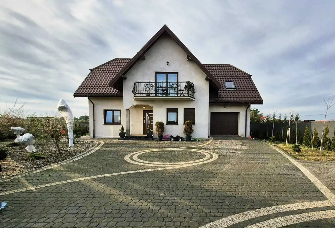 Podjazd z kostką brukową. Automatycznie otwierająca się brama garażowa.