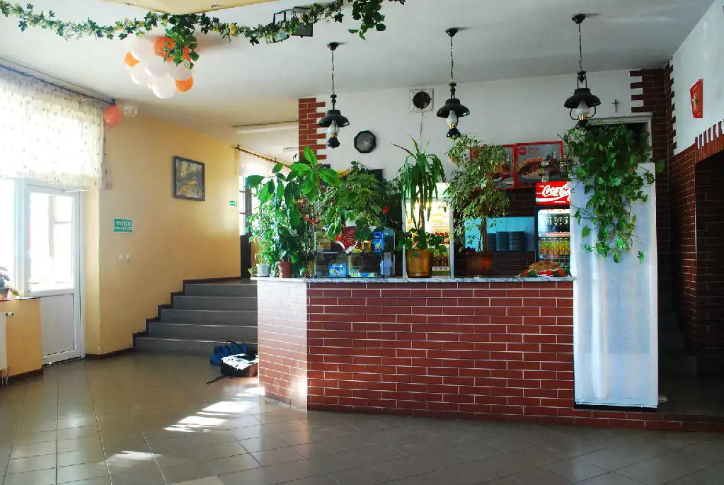 Przylegający budynek przeznaczony na salę imprez okolicznościowych (181m2 pow. użytk.)jest budynkiem parterowym z poddaszem użytkowym, niepodpiwniczonym, wykonanym w technologii tradycyjnej. Na parterze planowana jest sala imprez, natomiast na poddaszu 4 pokoje z łazienkami dla gości.Brak posadzek i stolarki okiennej.Budynek w stanie surowym otwartym (stopień zaawansowania inwestycji - 40%).