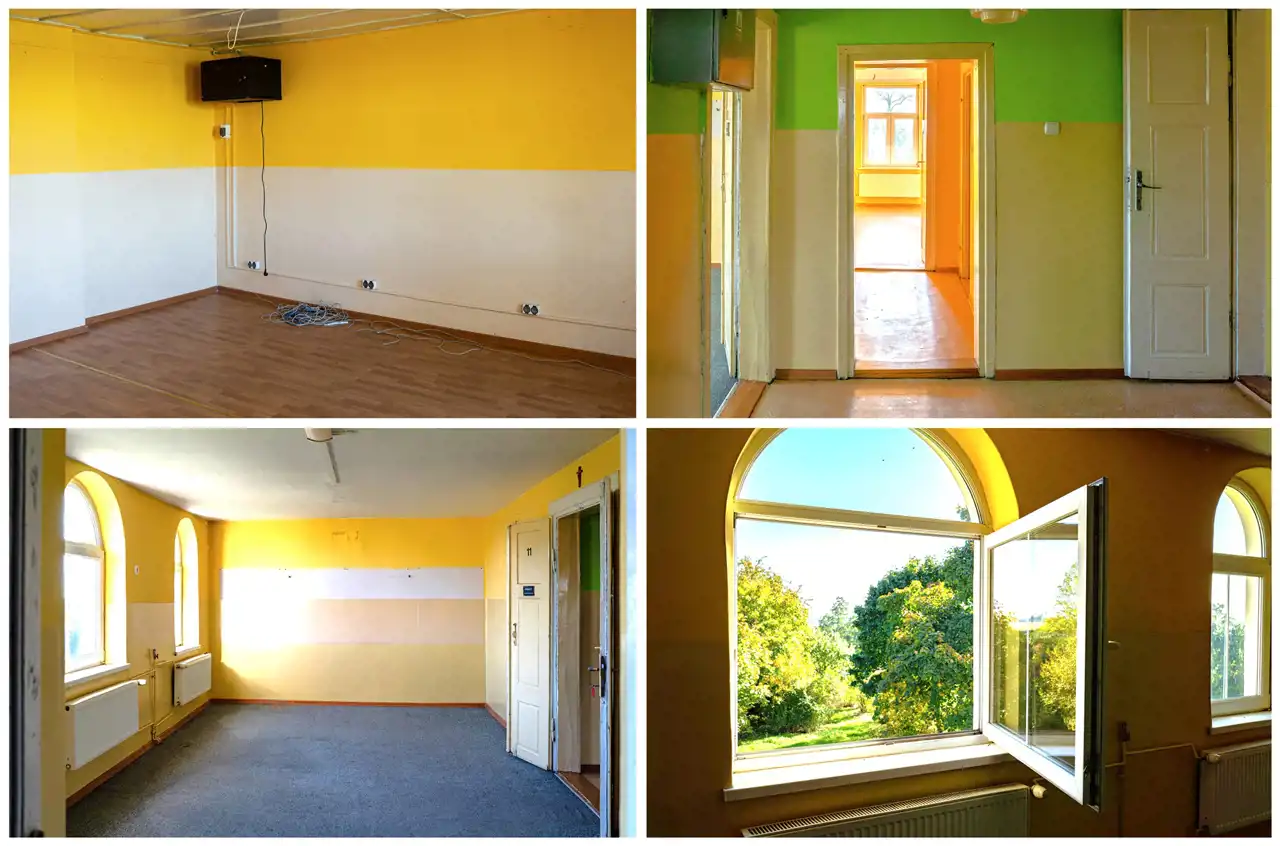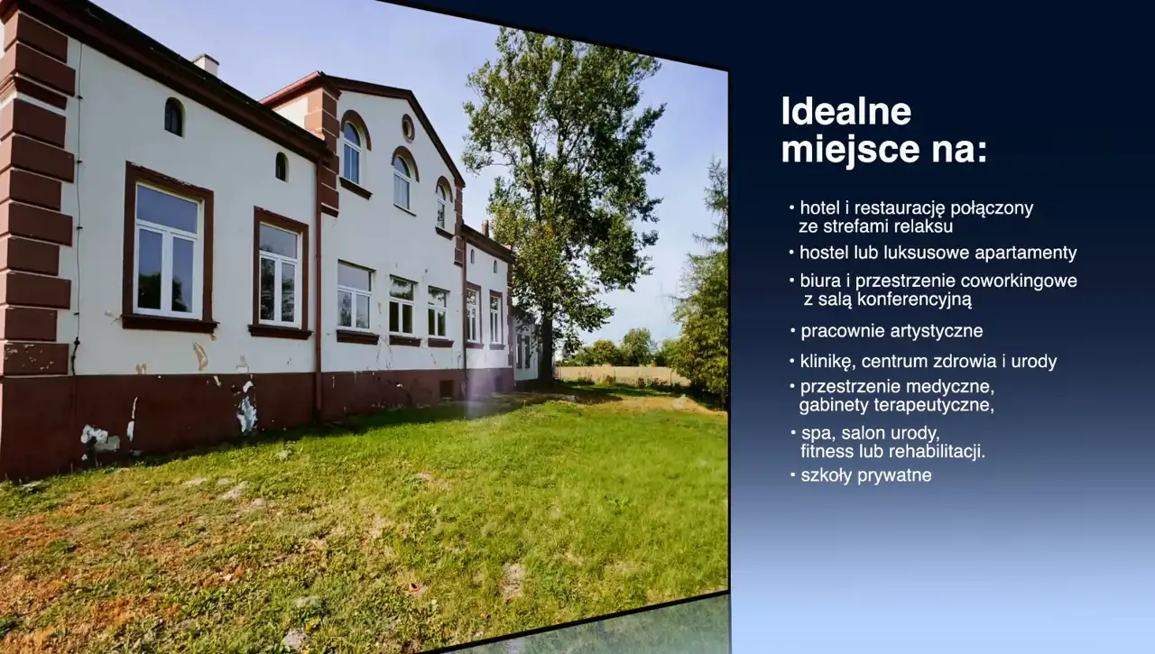 - Więcej zrozumienia mniej stresu -czyli szkolenia i warsztaty w tym miejscu. Dla osób chcących kontynuować misję oświatową tego lokalu w kierunku szkolenia młodzieży bądź osób dorosłych. Ponieważ budynek jest doskonale przystosowany pod sale wykładowe a strategiczny układ pomieszczeń gospodarczych pozwoli na utrzymanie wysokich standardów estetycznych i sanitarnych. Przykładem mogłyby być: szkoły prywatne, centrum konferencyjno-szkoleniowe, centrum coachingowe, obozy językowe, warsztaty dla terapeutów czy joginów, kursy terapii, szkolenia leczenia holistycznego. Jak również gospodarstwo agroturystyczne ze stadniną koni.