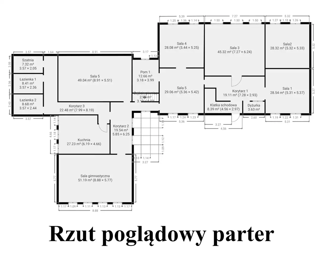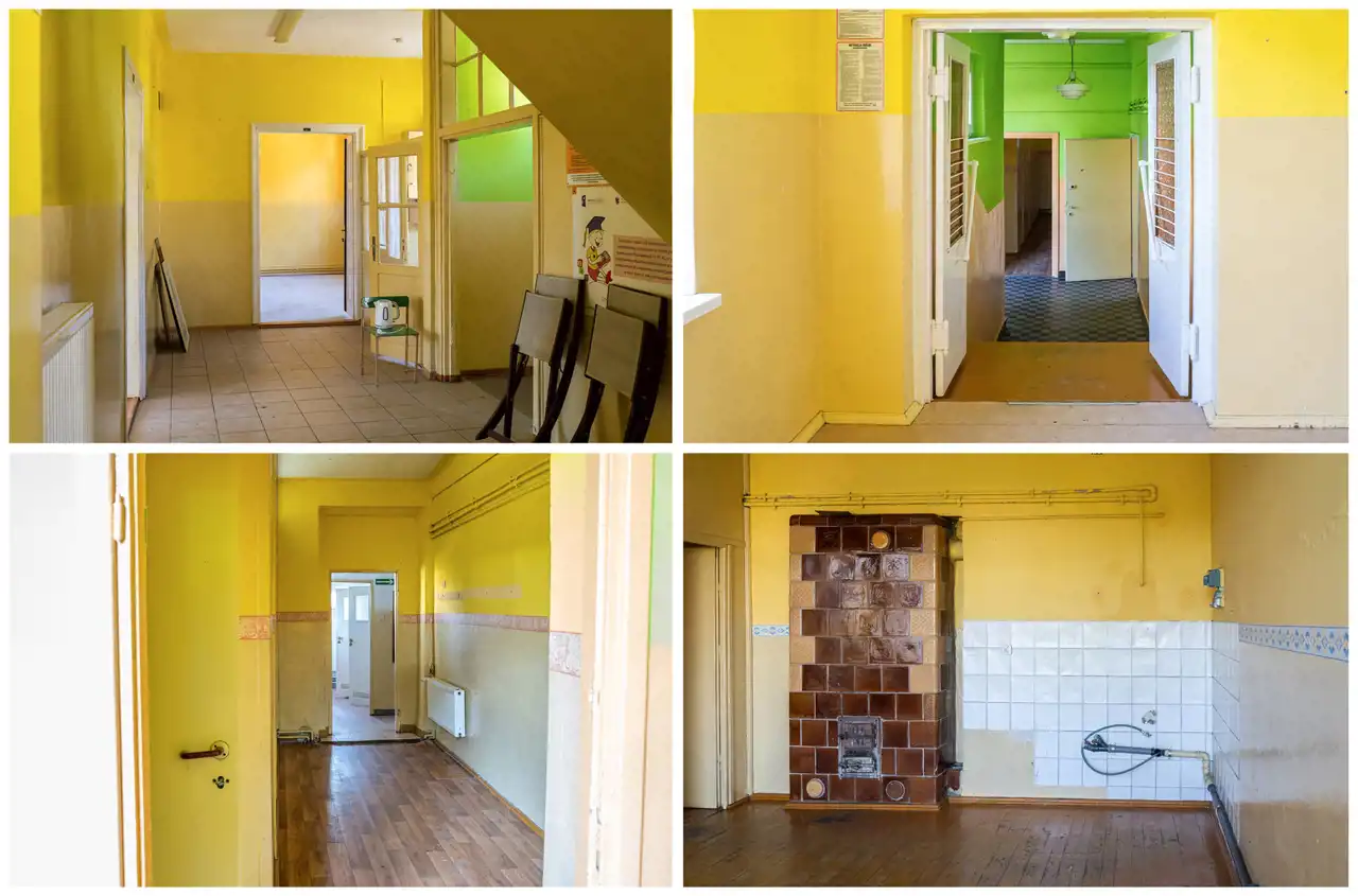 Parter 384,05 m2: 5 pokoi (o powierzchniach: 27.04 m2 28.09 m2 45.5 m2 27.75 m2 49.45 m2), trzy korytarze (o powierzchniach: 17.25 m2 20.23 m2 23.74 m2, klatka schodowa o pow. 4.86 m2, dyżurka 3 m2, hol 28.09 m2, kuchnia 32.4 m2, szatnia 6.3 m2, dwie łazienki (o powierzchniach: 9.73 m2 i 9.45 m2), sala gimnastyczna/konferencyjna o pow. 51.17 m2.