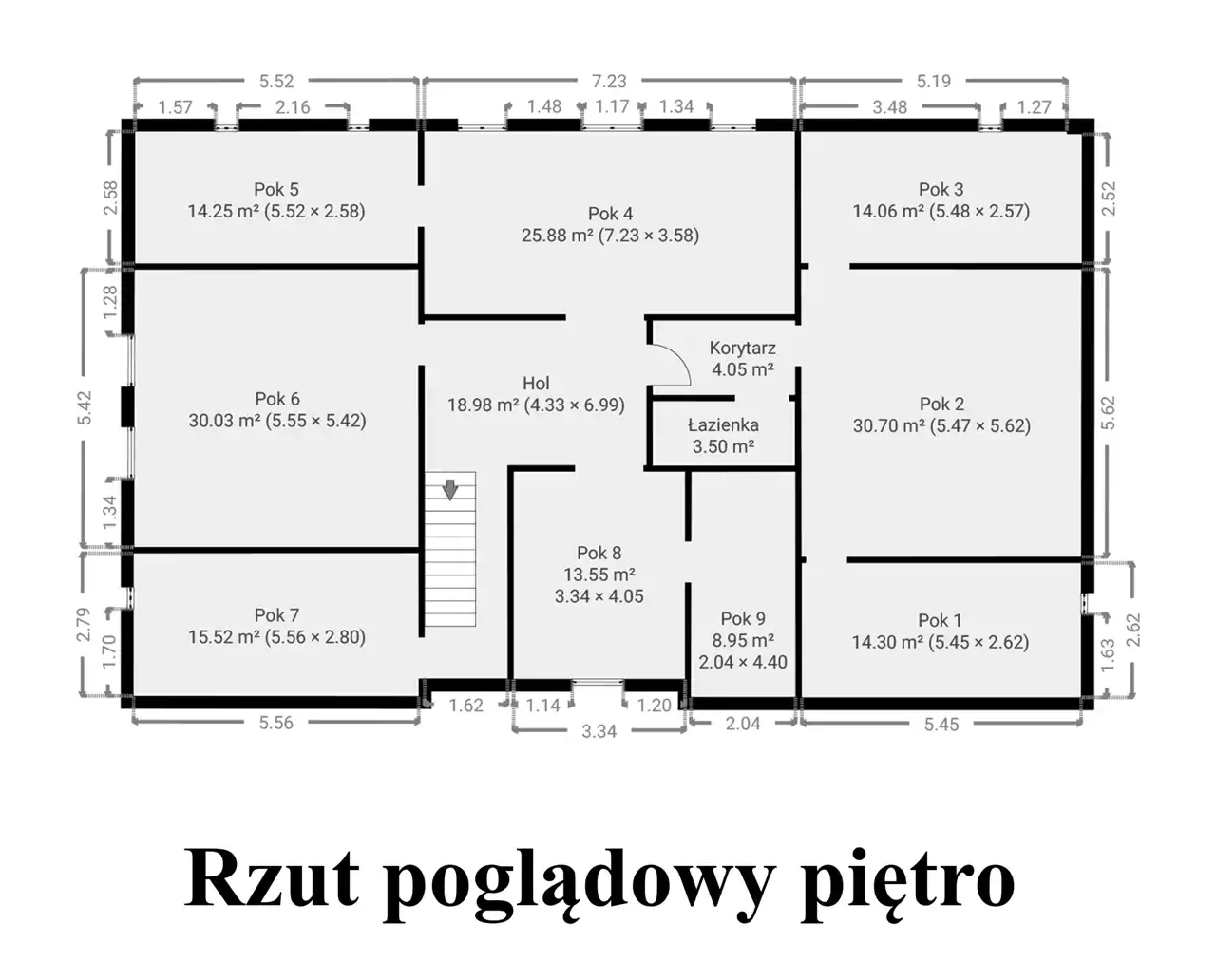 Piętro 157,79 m2 : 9 pokoi (o powierzchniach: 27.55 m2, 22.1 m2, 10.46 m2, 10.47 m2, 10.46 m2, 10,47 m2, 7.6 m2, 26 m2, 13.04 m2), hol 11.62 m2, korytarz 4.2 m2, łazienka 3.81 m2.