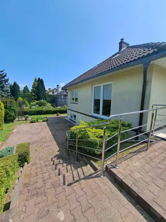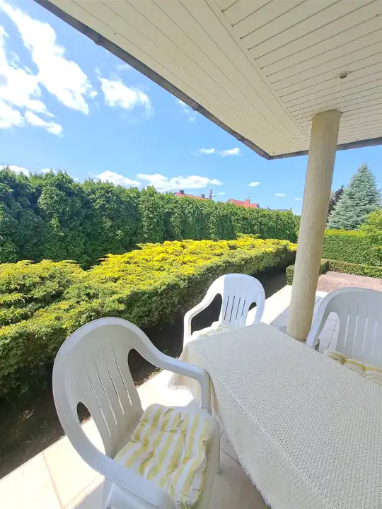Wokół domu znajduje się zadbany, z gustem urządzony ogród, a tuż przy budynku – taras, który stanowi idealne miejsce na wypoczynek lub spotkania z rodziną i przyjaciółmi.