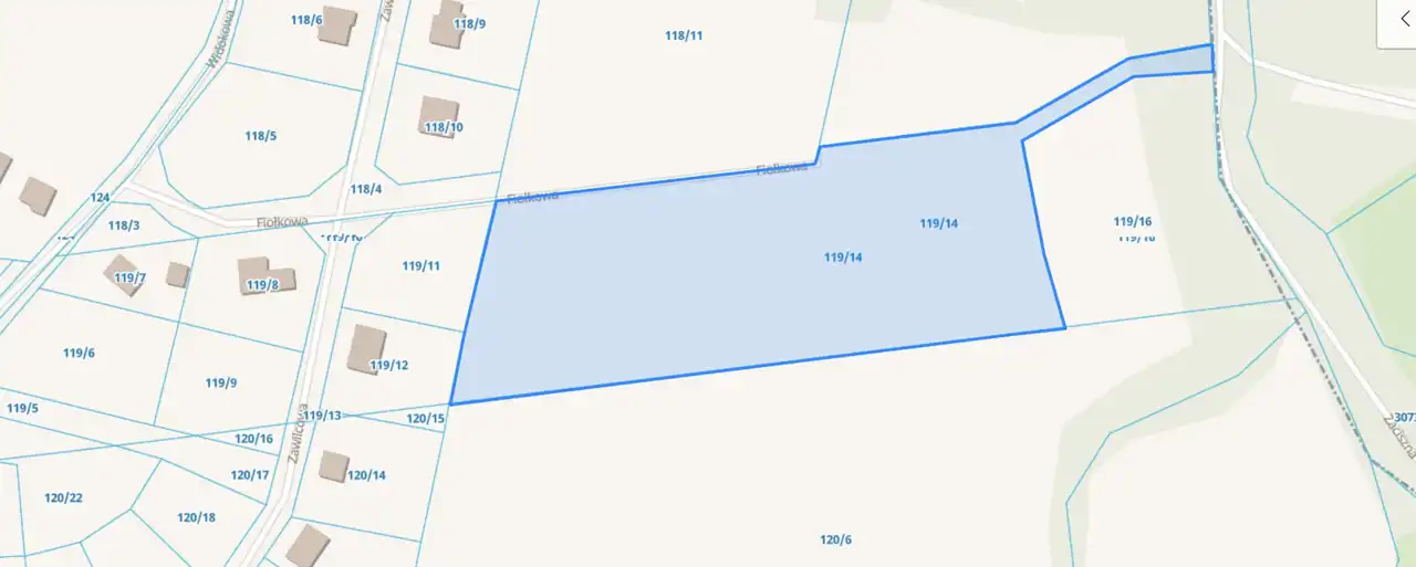 Powierzchnia całkowita 15 885 m2 z możliwością podziału na 12 działek budowlanych plus działka drogowa.