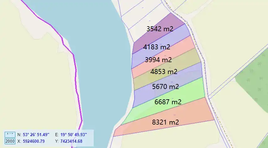 Działki mają powierzchnię od 3542 m2 do 8321 m2 i posiadają dostęp do drogi gminnej.