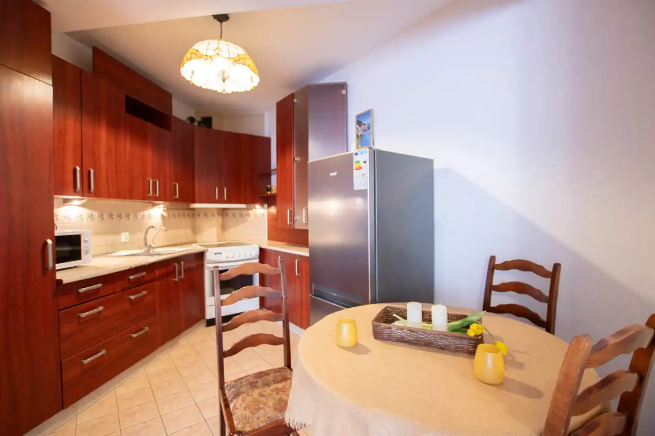 -Kuchnia: Zabudowa meblowa, zlewozmywak,kuchenka z okapem, lodówka, stół z krUzesłami