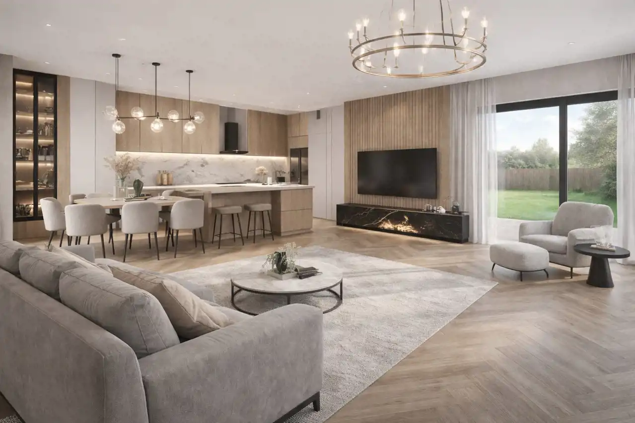 -Przestronny salon z jadalnią i dużymi przeszkleniami z wyjściem na taras