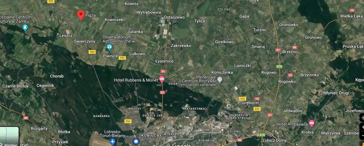 Działka narożna bardzo atrakcyjnie zlokalizowana ,spokojna okolica -dojazd do Torunia ok 10 minut bez korków.