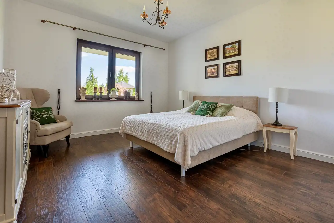 Dom wolnostojący, z dwoma kondygnacjami nadziemnymi, wybudowany w 2014 roku w cichym i spokojnym miejscu. Działka o łącznej powierzchni 3711 m2 uzbrojona jest w sieć elektroenergetyczną, wodociągową (oprócz wodociągu gminnego dodatkowo własne ujęcie wody) oraz kanalizacyjną. Na działce fotowoltaika. Dom ogrzewany pompą ciepła. Rekuperacja. Ogród zagospodarowany z rozprowadzonym nawodnieniem - m.in. wydzielone miejsce zadzaszone pod grilla, warzywniak, wiata na garażowanie dodatkowych aut.