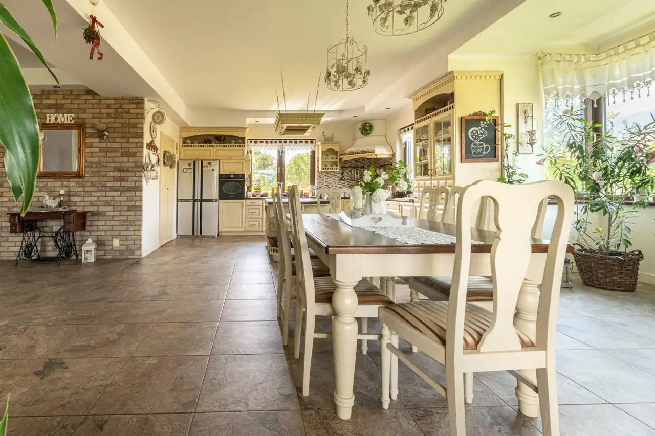 - otwarta kuchnia połączona z jadalnią o powierzchni 44 m2 - na podłodze gres, do dyspozycji klimatyczna drewniana kuchnia wraz ze sprzętami agd, z jadalni widok na ogród, dodatkowo wyjście na przestronny taras, przy kuchni wygospodarowano spiżarnię,