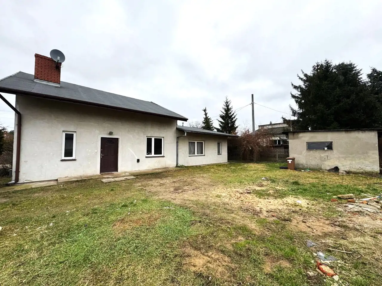 Dom wymaga remontu, co daje przyszłemu właścicielowi pełną swobodę w dostosowaniu przestrzeni do własnych potrzeb i gustu. Nieruchomość posiada funkcjonalny układ pomieszczeń, który pozwala na stworzenie wygodnej przestrzeni dla rodziny lub adaptację na cele inwestycyjne.
