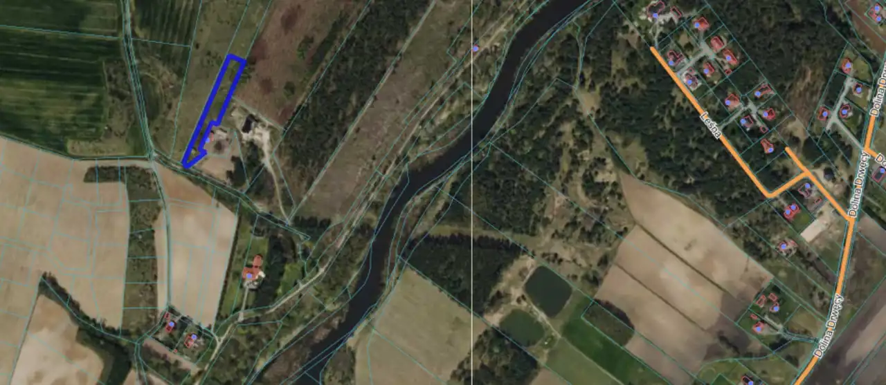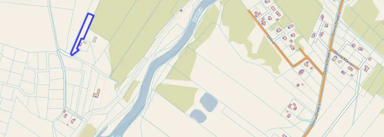Działka w kształcie prostokąta o powierzchni 4448 m2 zlokalizowana w bardzo atrakcyjnej okolicy.