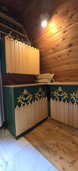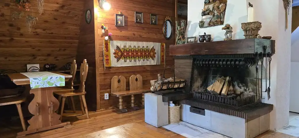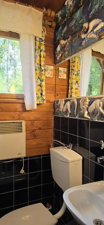Domek przykryty jest nową blachą (2024r.), ściany oraz skosy ocieplone zostały styropianem.
