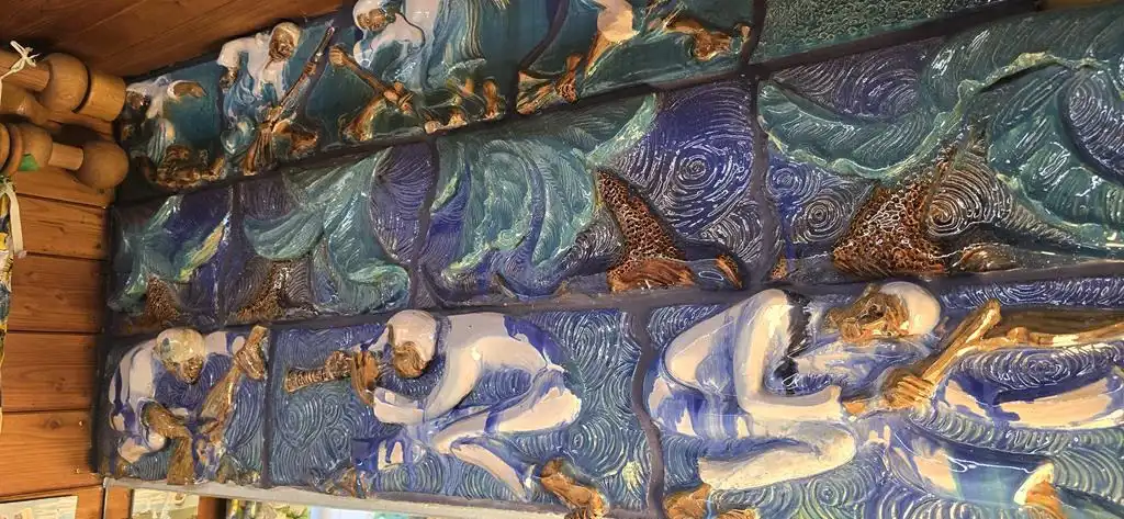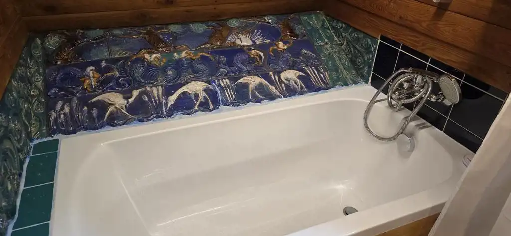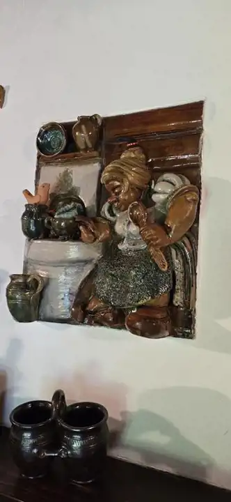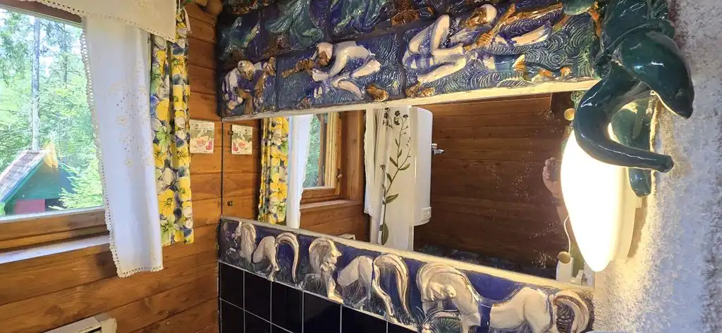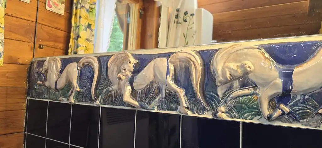 W salonie oraz łazience są specjalnie wykonane pod zamówienie i wkomponowane w ściany płyty porcelanowe autorstwa artystki ceramiki pani Marii Konarzewskiej-Wszołek.