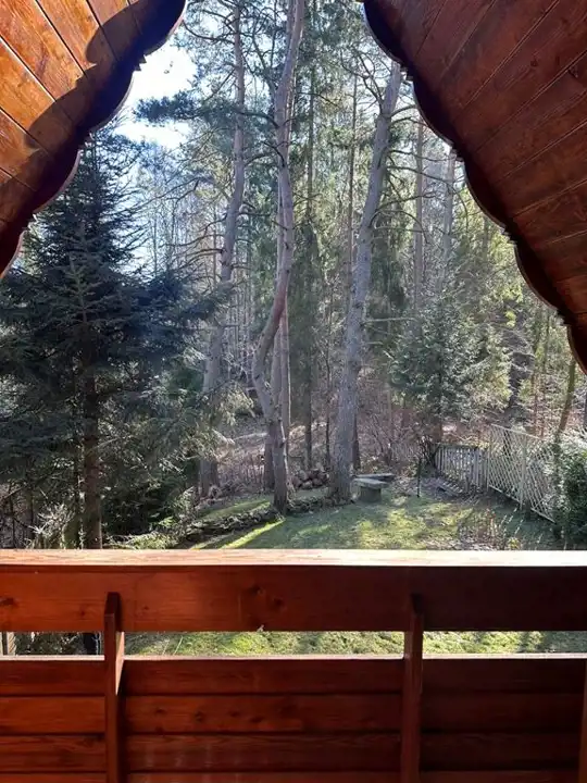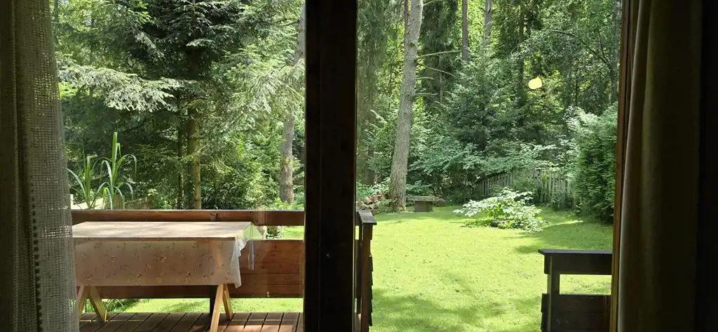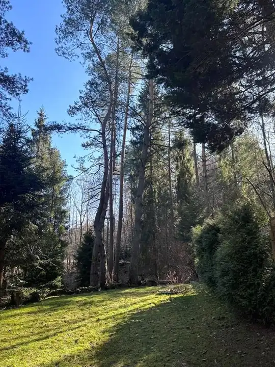 Działka położona w lesie z kilkoma pięknymi sosnami na terenie działki. Ponadto działka w całości zagospodarowana z wieloma ozdobnymi krzewami. W granicy działki przepływa mały strumyczek (bez zagrożenia wylaniem na działkę - nie było przez ponad 40 lat takiej sytuacji)