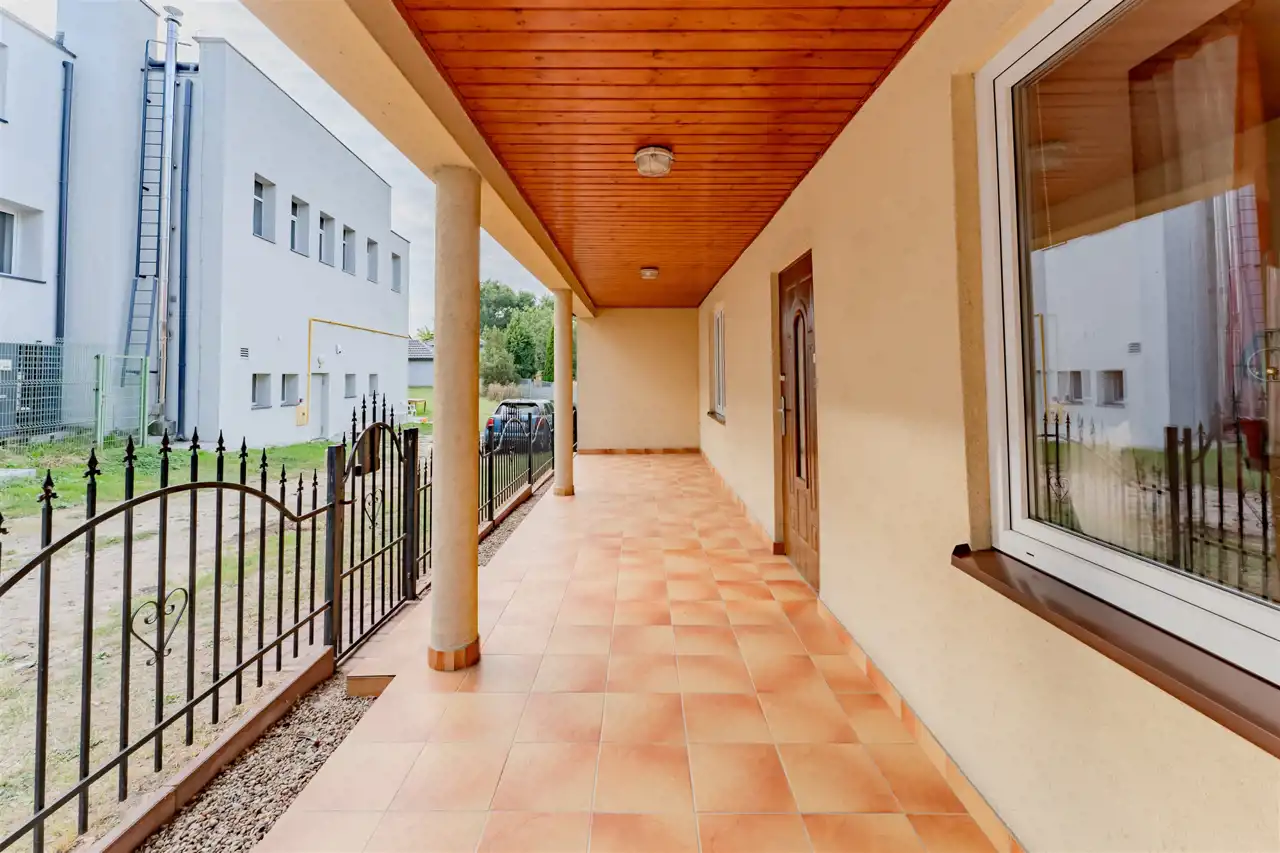 Przed wejściem do budynku znajduje się zadaszony taras o powierzchni 5,4 m².