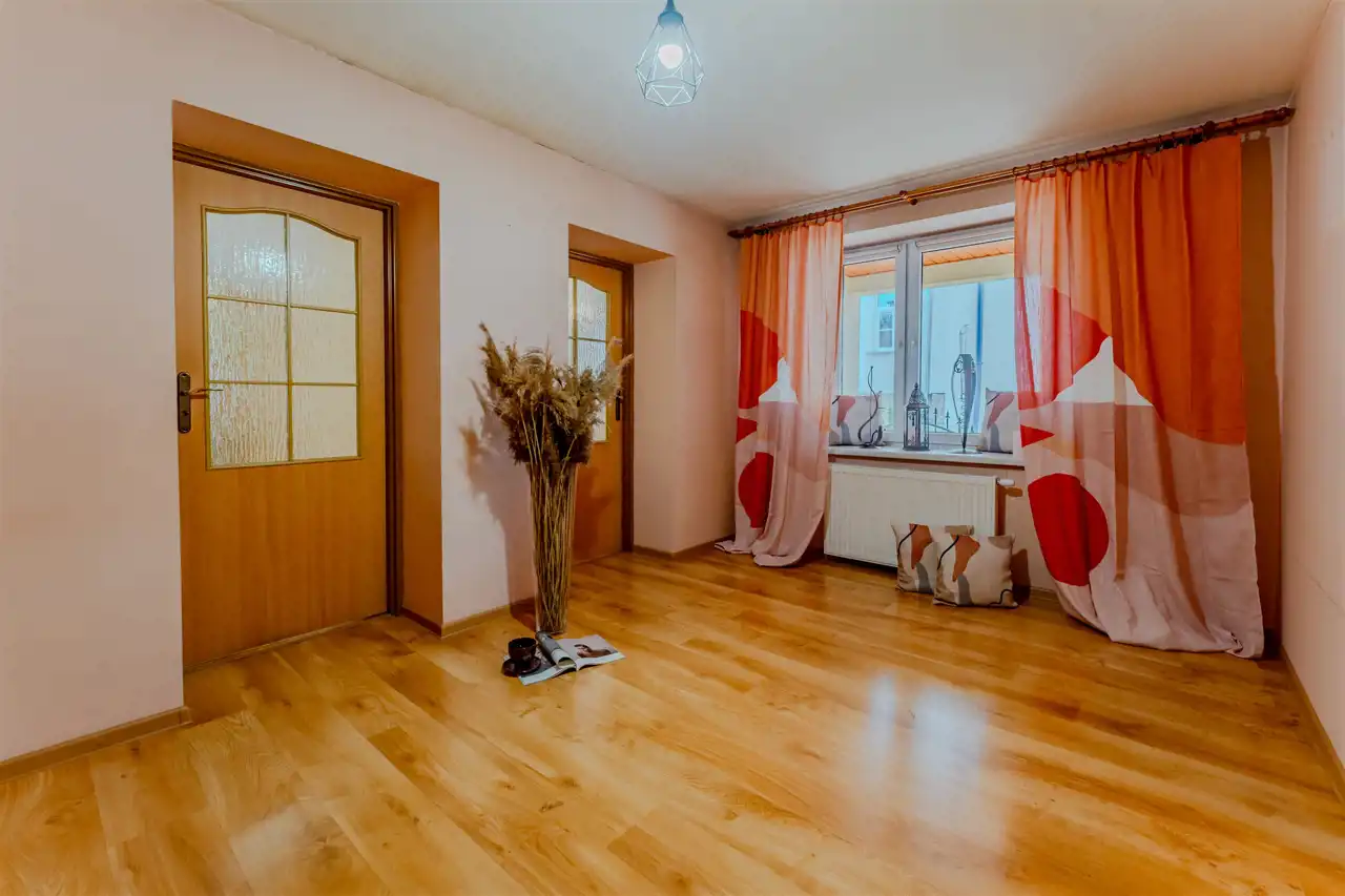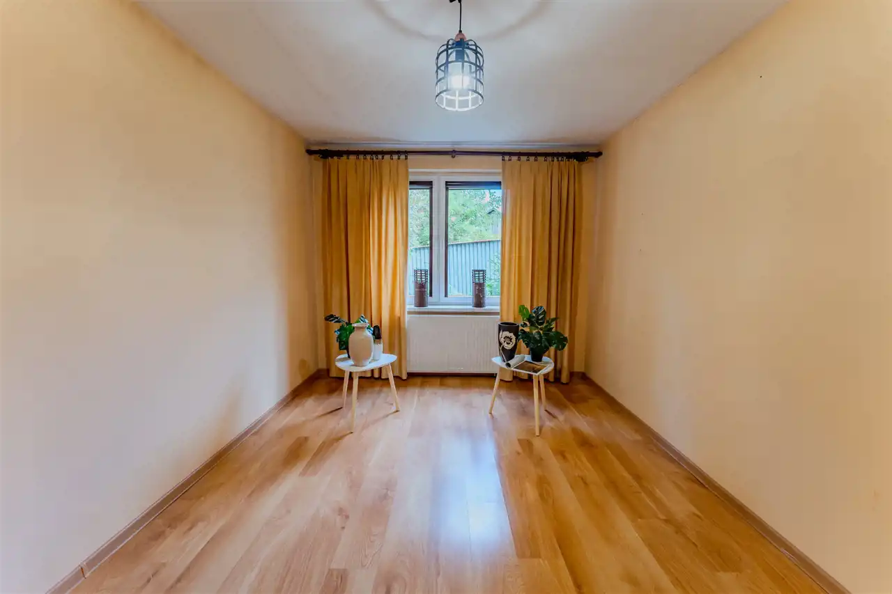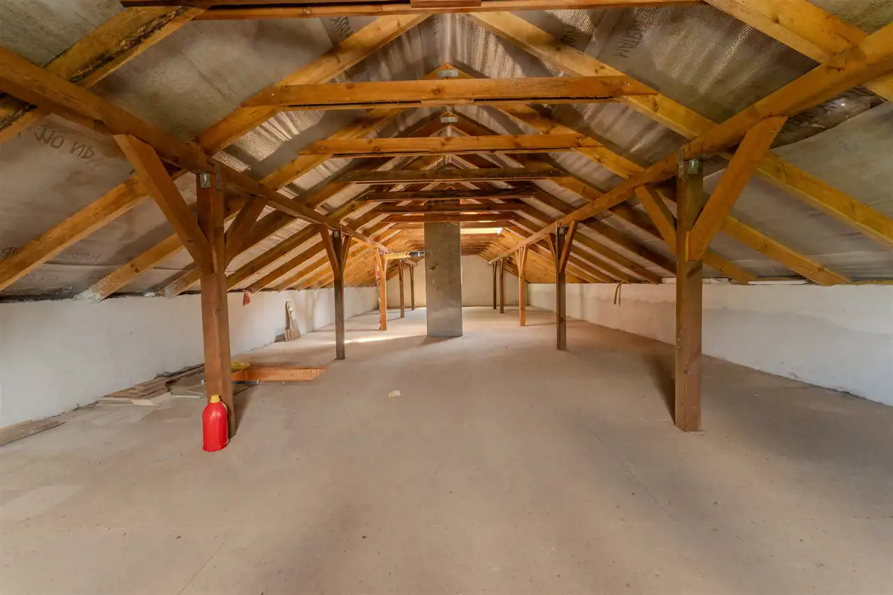 Parterowy budynek obejmuje cztery przestronne pokoje, funkcjonalną kuchnię, korytarz, hol, łazienkę, oddzielne WC, pomieszczenie gospodarcze oraz kotłownię. Dodatkowo, do dyspozycji pozostaje niezagospodarowane poddasze użytkowe, dające możliwość dalszej adaptacji zgodnie z potrzebami przyszłych właścicieli.