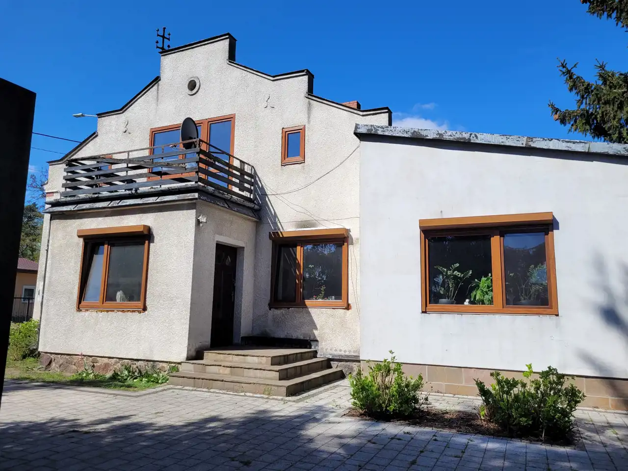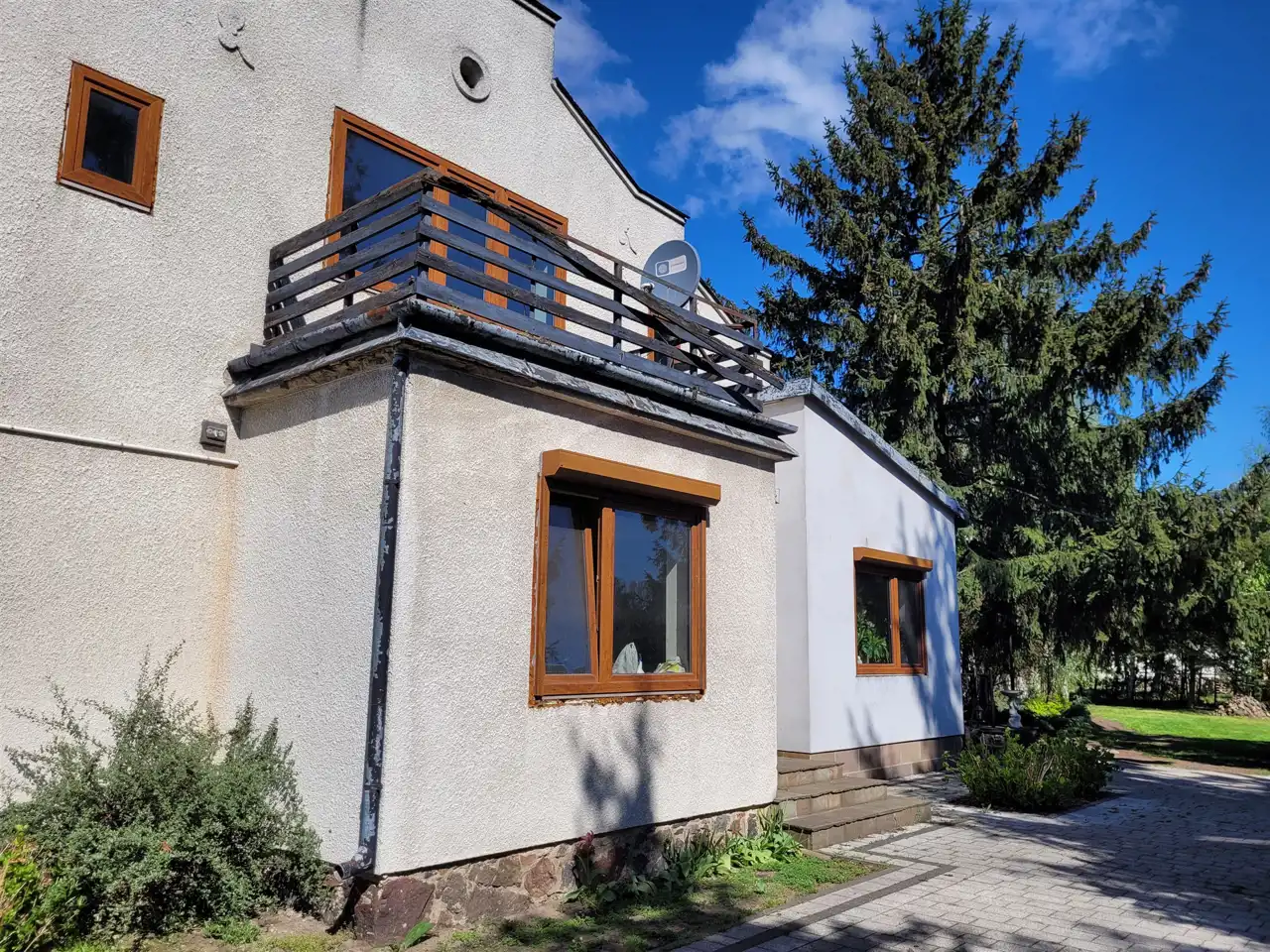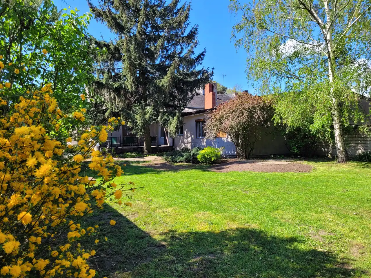 Dom usadowiony na dużej działce zagospodarowanej drzewami oraz niższymi nasadzeniami, wjazd na posesje utwardzony.