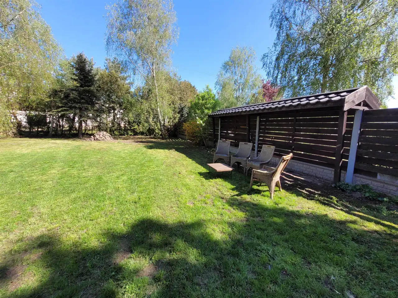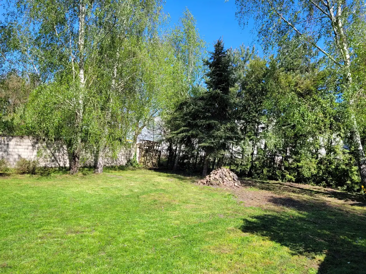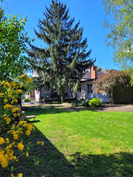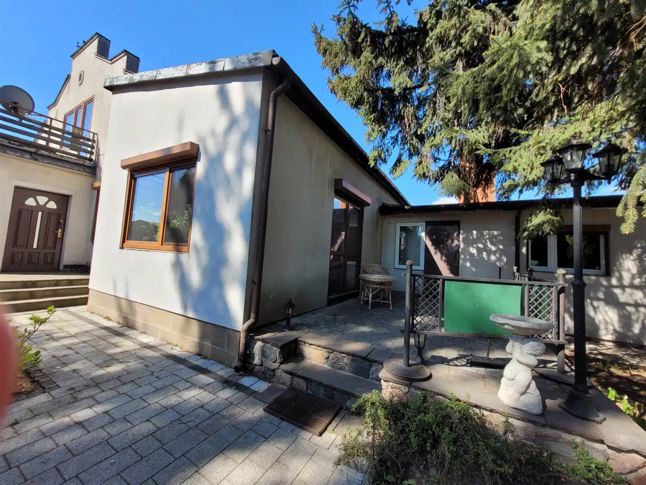 Dom usadowiony na dużej działce zagospodarowanej drzewami oraz niższymi nasadzeniami, wjazd na posesje utwardzony.