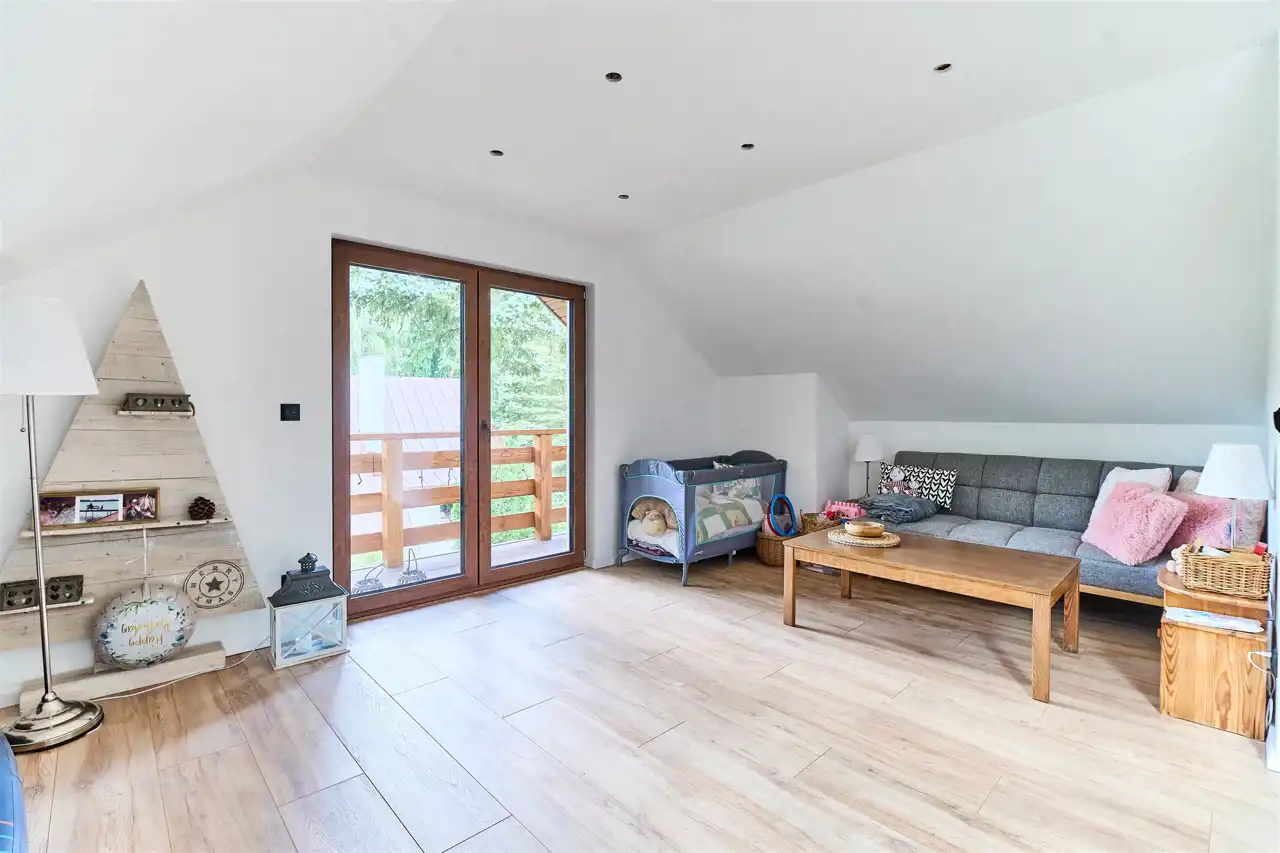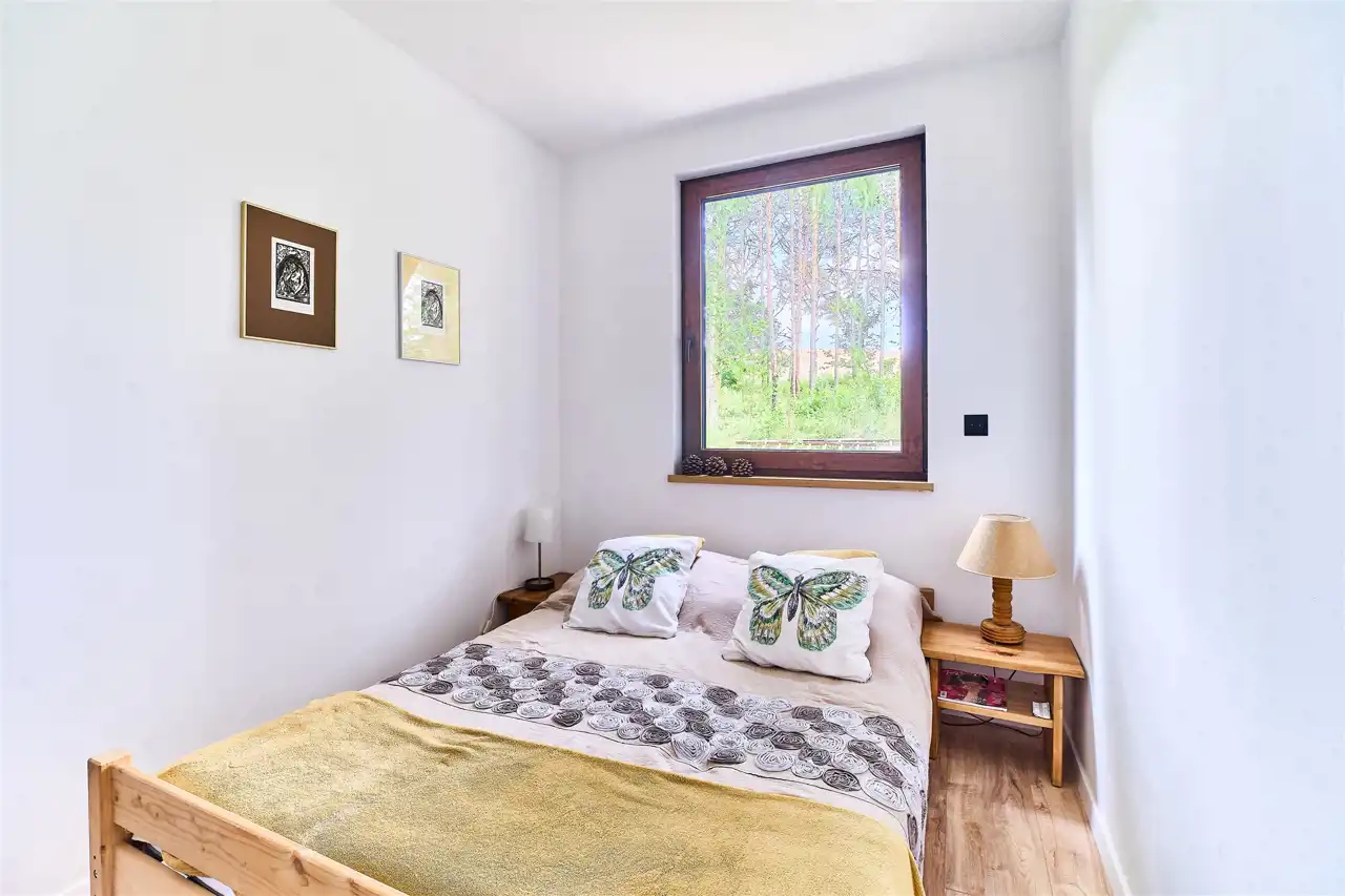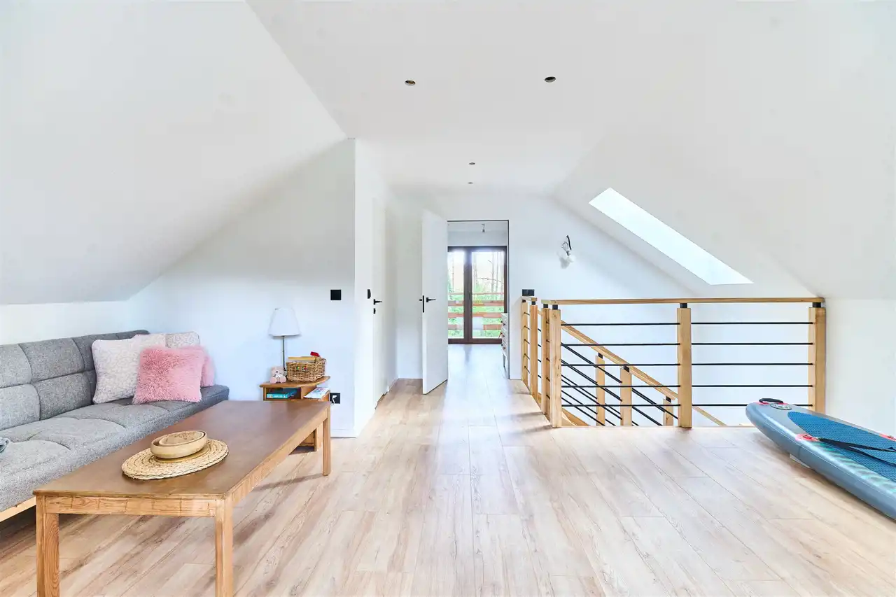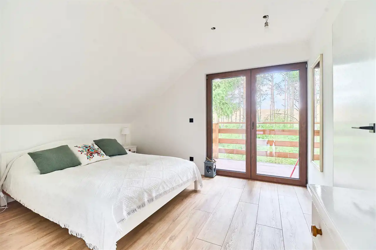 Budynek mieszkalny wolnostojący, podpiwniczony, czteropokojowy. Wybudowany w 2023 roku, w technologii szkieletowej wyizolowany podwójną warstwą z wełny mineralnej i skalnej. Powierzchnia użytkowa domu wynosi 89 m2. Obecnie są dwie sypialnie z dostępem do indywidualnych balkonów i możliwością zrobienia trzech sypialni, dwie łazienki i duży, otwarty salon z kuchnią, który dodatkowo ma dostęp do dużego narożnego tarasu.