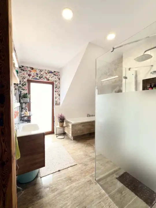 Na podłogach zadbana glazura oraz na panele; na ścianach gładzie oraz tapety, w całym domu liczne oświetlenie ledowe.