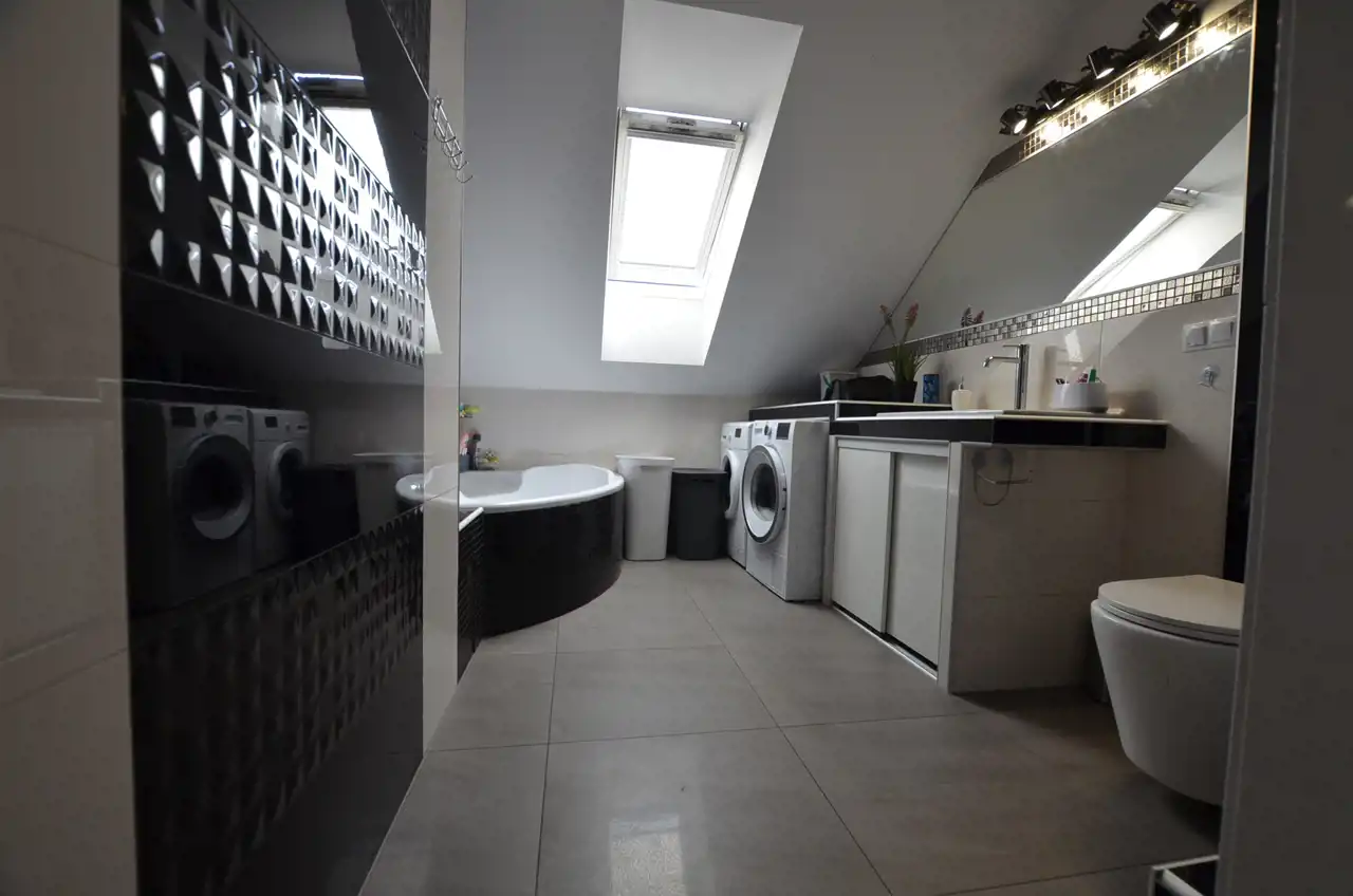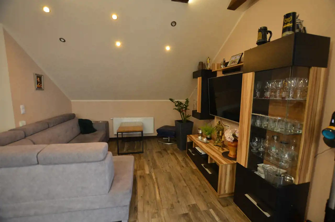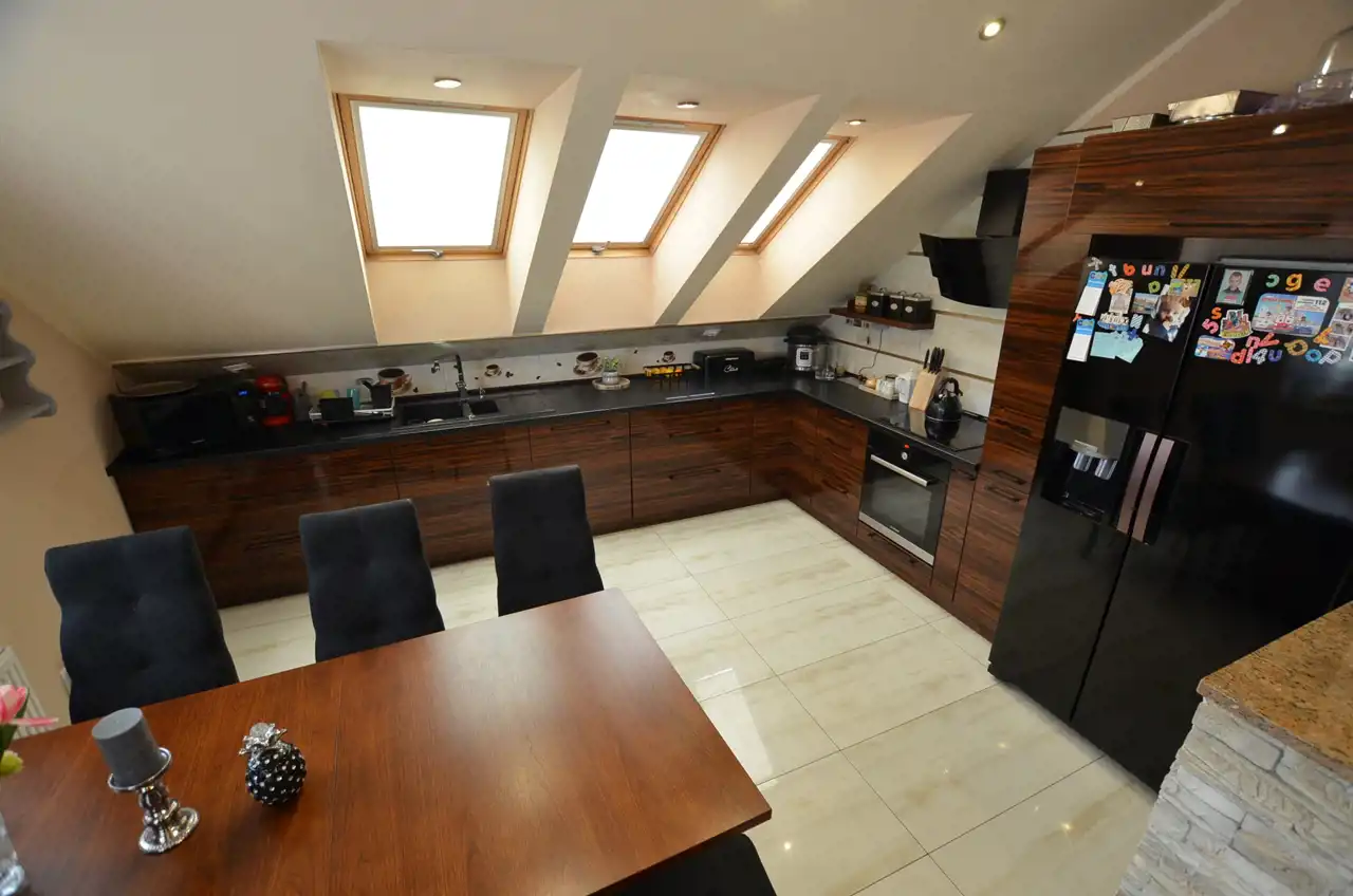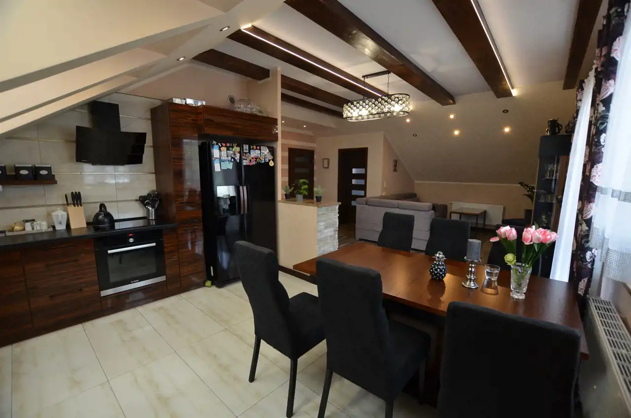 Na poddaszu wydzielono mieszkanie 120 m2 w którym część dzienną stanowi połączona jednoprzestrzennie kuchnia z salonem, zabudowa kuchenna na tym poziomie pozostaje na wyposażeniu. Z salonu wyjście na zadaszony taras ok 21 m2 dodatkowo 3 pokoje i łazienka z wc. Poddasze przeszło generalny remont w 2015r