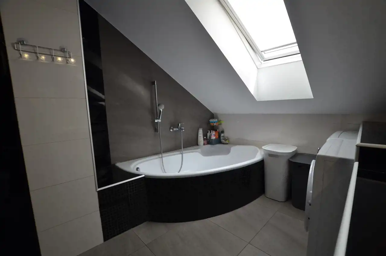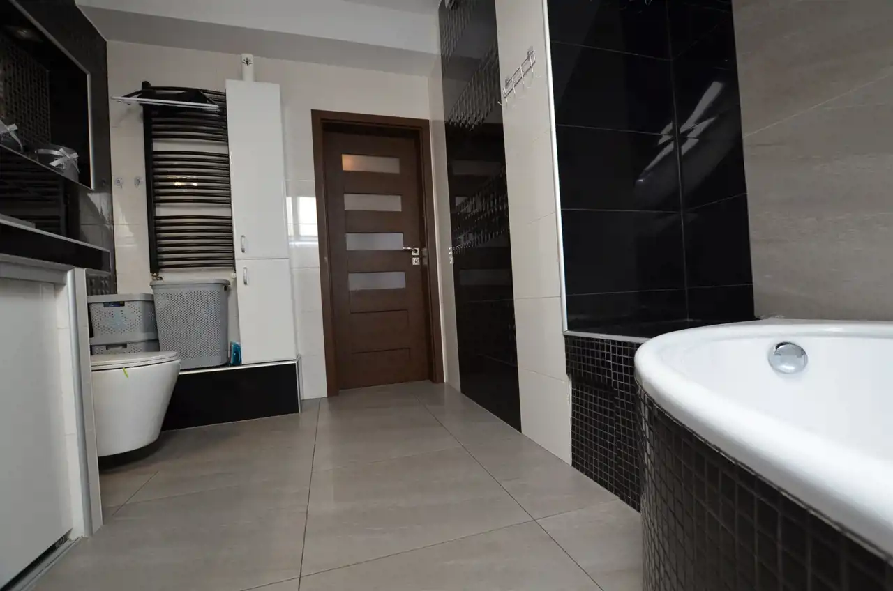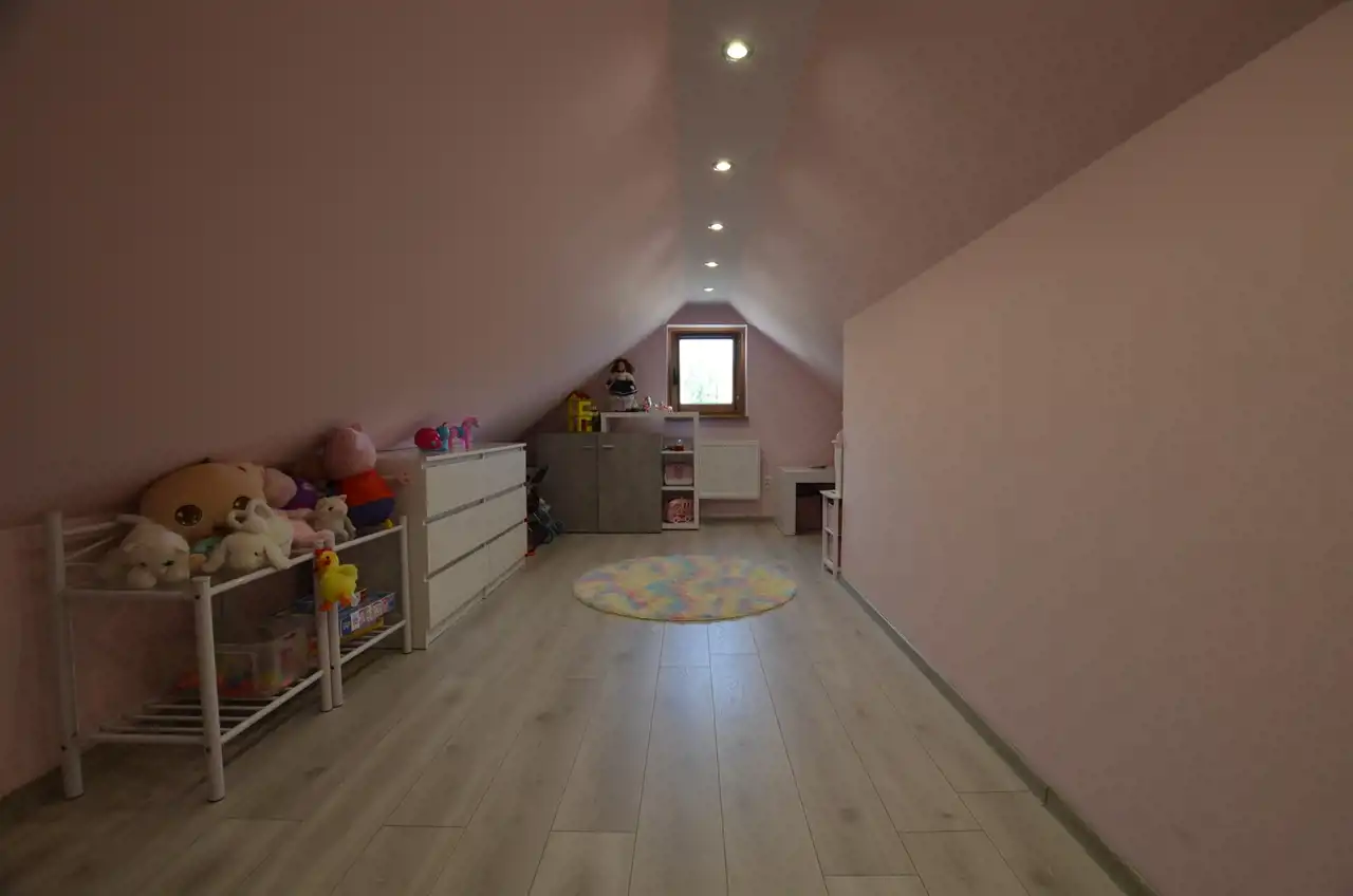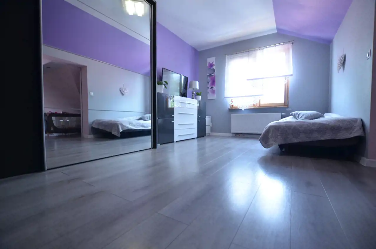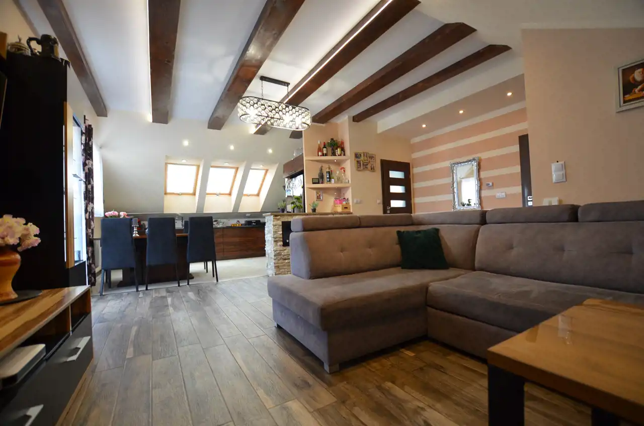 Na poddaszu wydzielono mieszkanie 120 m2 w którym część dzienną stanowi połączona jednoprzestrzennie kuchnia z salonem, zabudowa kuchenna na tym poziomie pozostaje na wyposażeniu. Z salonu wyjście na zadaszony taras ok 21 m2 dodatkowo 3 pokoje i łazienka z wc. Poddasze przeszło generalny remont w 2015r