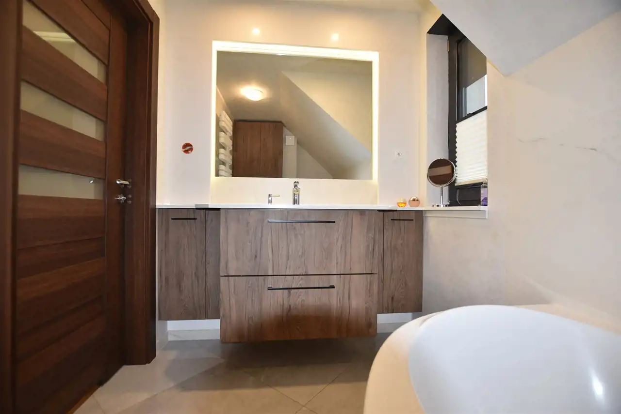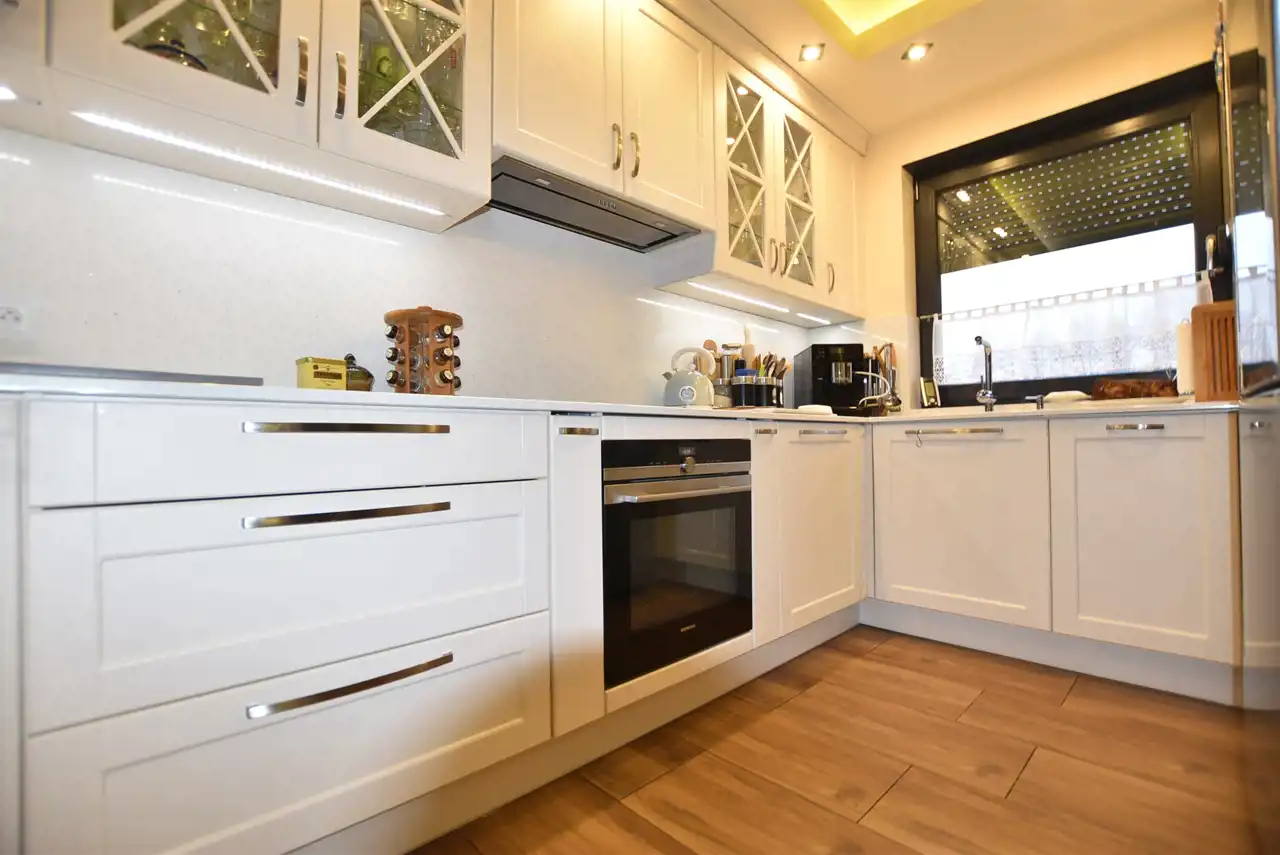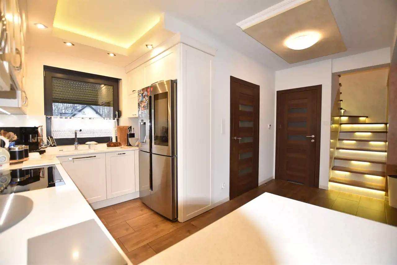 Kuchnia wykończona konglomeratem kwarcowym na ścianie i blacie, tworząc spójną, elegancką całość z salonem. Umeblowana na wymiar w stylu klasycznym (fronty drewniane akrylowe) ze sprzętem AGD firmy SIEMENS tj: indukcja 4- palnikowa osadzona na równi z blatem, zlewozmywak jednokomorowy podwieszany, piekarnik elektryczny, pochłaniacz pary firmy FALMEC, zmywarka, lodówka dwudrzwiowa firmy Samsung z wbudowanym tabletem i czterema kamerami wewnątrz (najwyższy dostępny model).