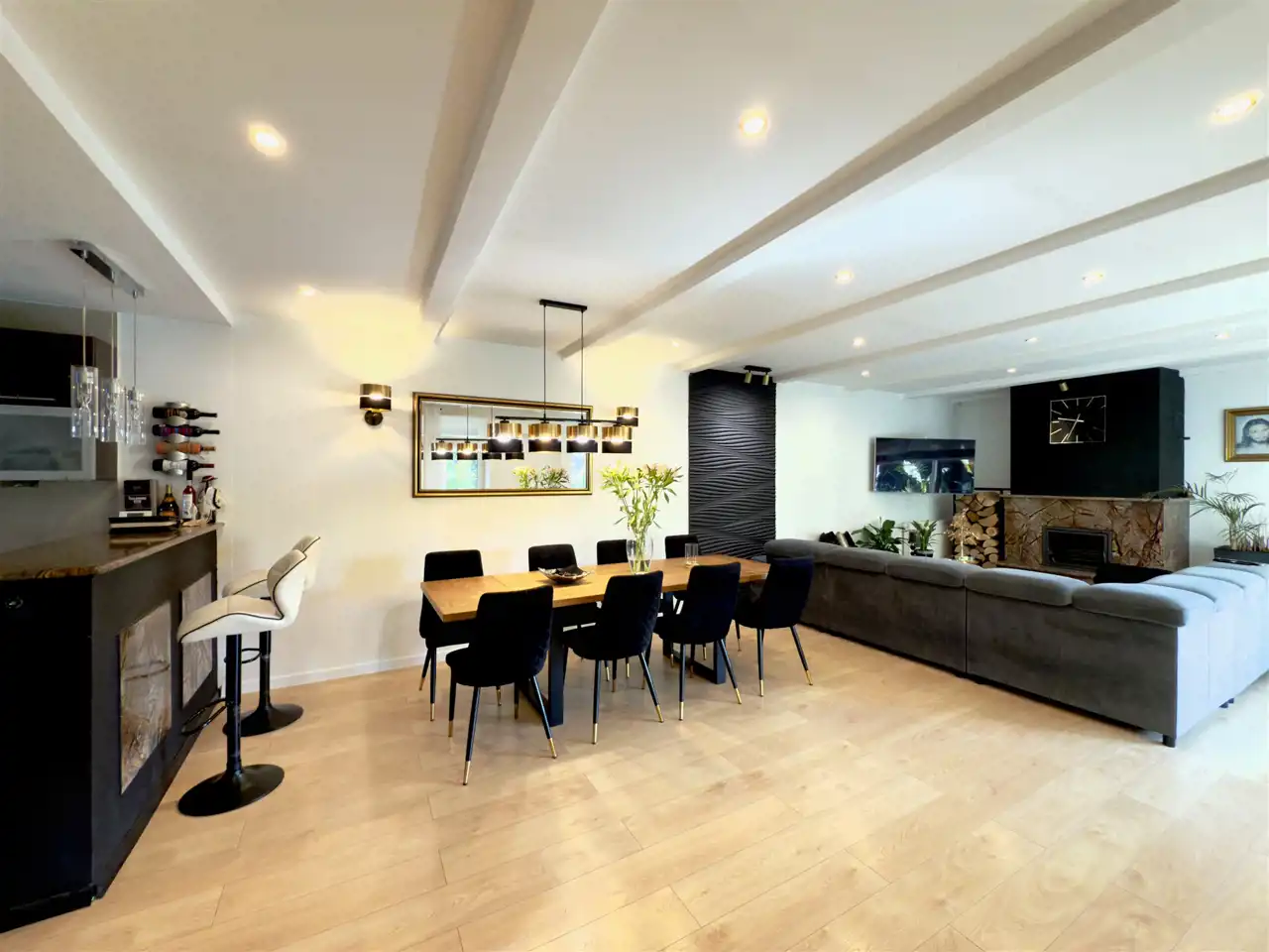 ok. 40 m² salon – pięknie doświetlony przez całą ścianę przeszkleń; kominek jako serce domu,