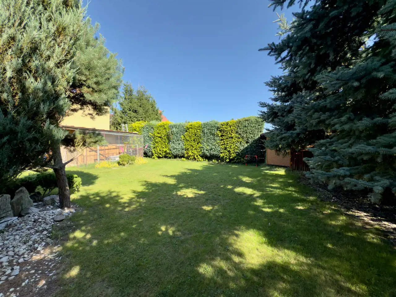 Działka 8,73 a (ok. 873 m²) – starannie zagospodarowana, z licznymi nasadzeniami roślin i krzewów ozdobnych.