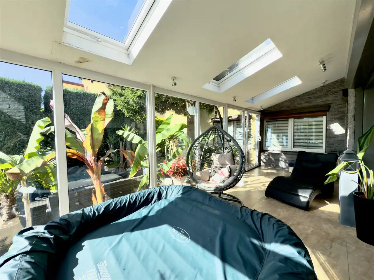 Oranżeria przy salonie – przestrzeń na jacuzzi i kącik wypoczynkowy.