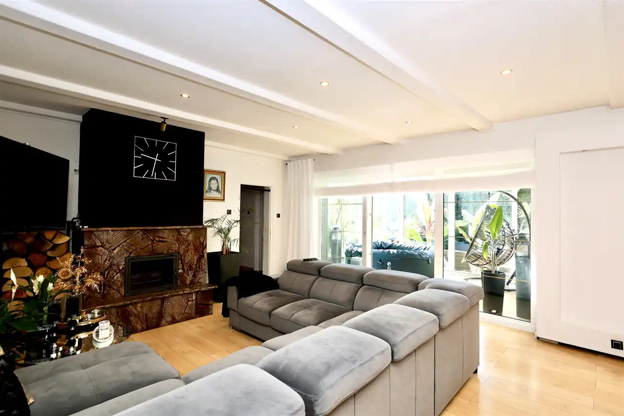 40-metrowy salon z szeroką przeszkloną ścianą i marmurowym kominkiem.