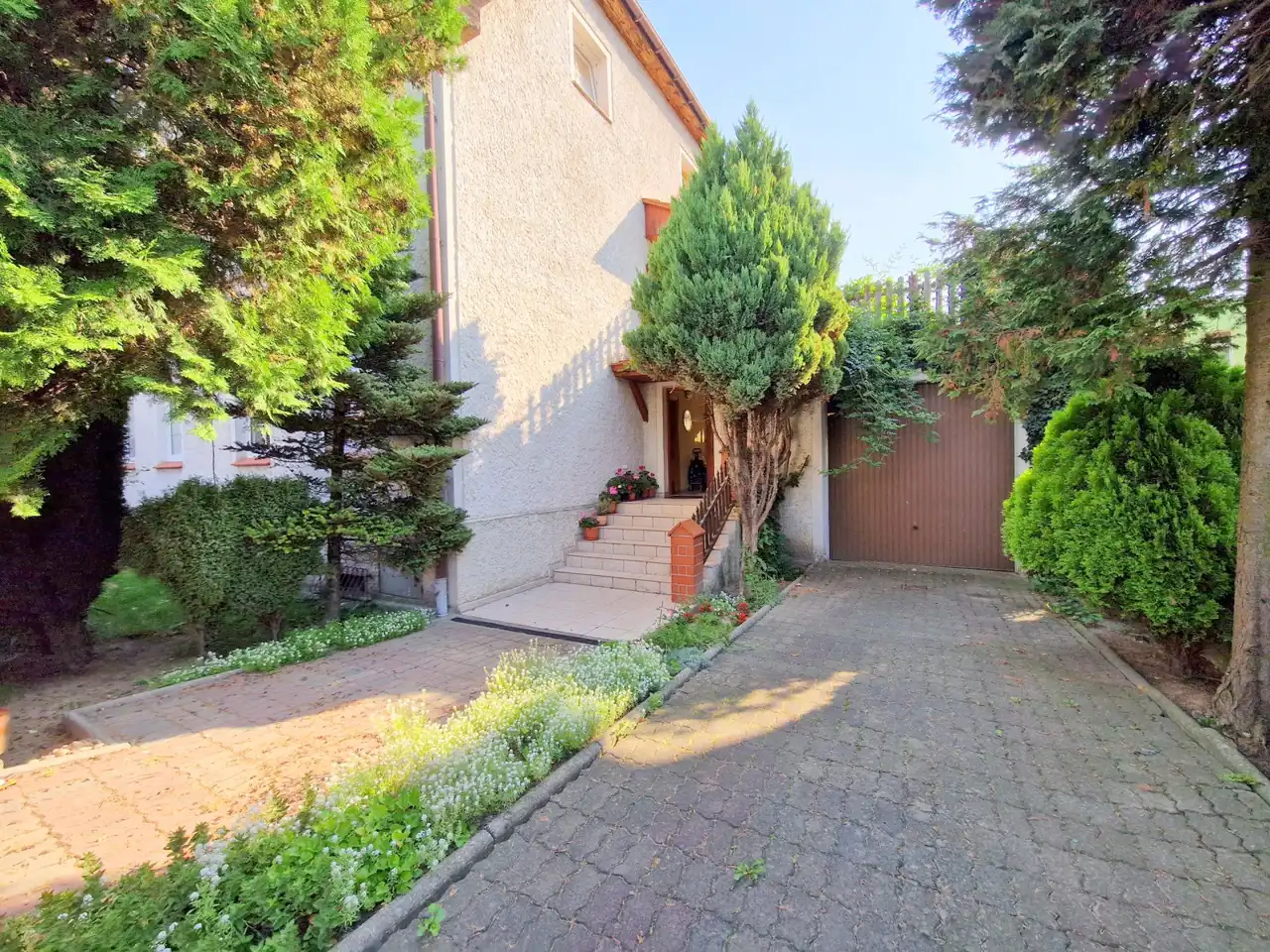 Wejście do budynku z dwóch stron. Działka ogrodzona.