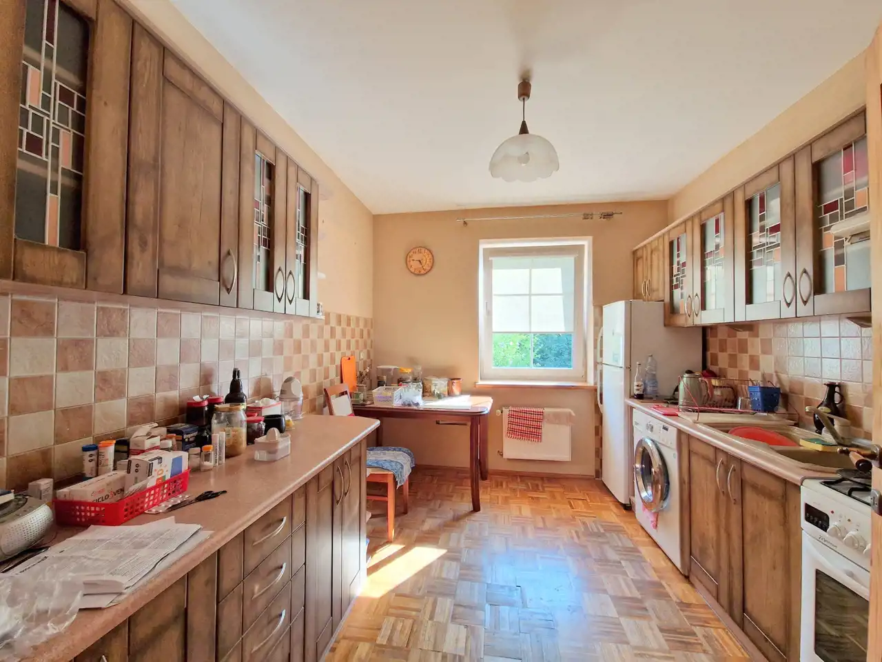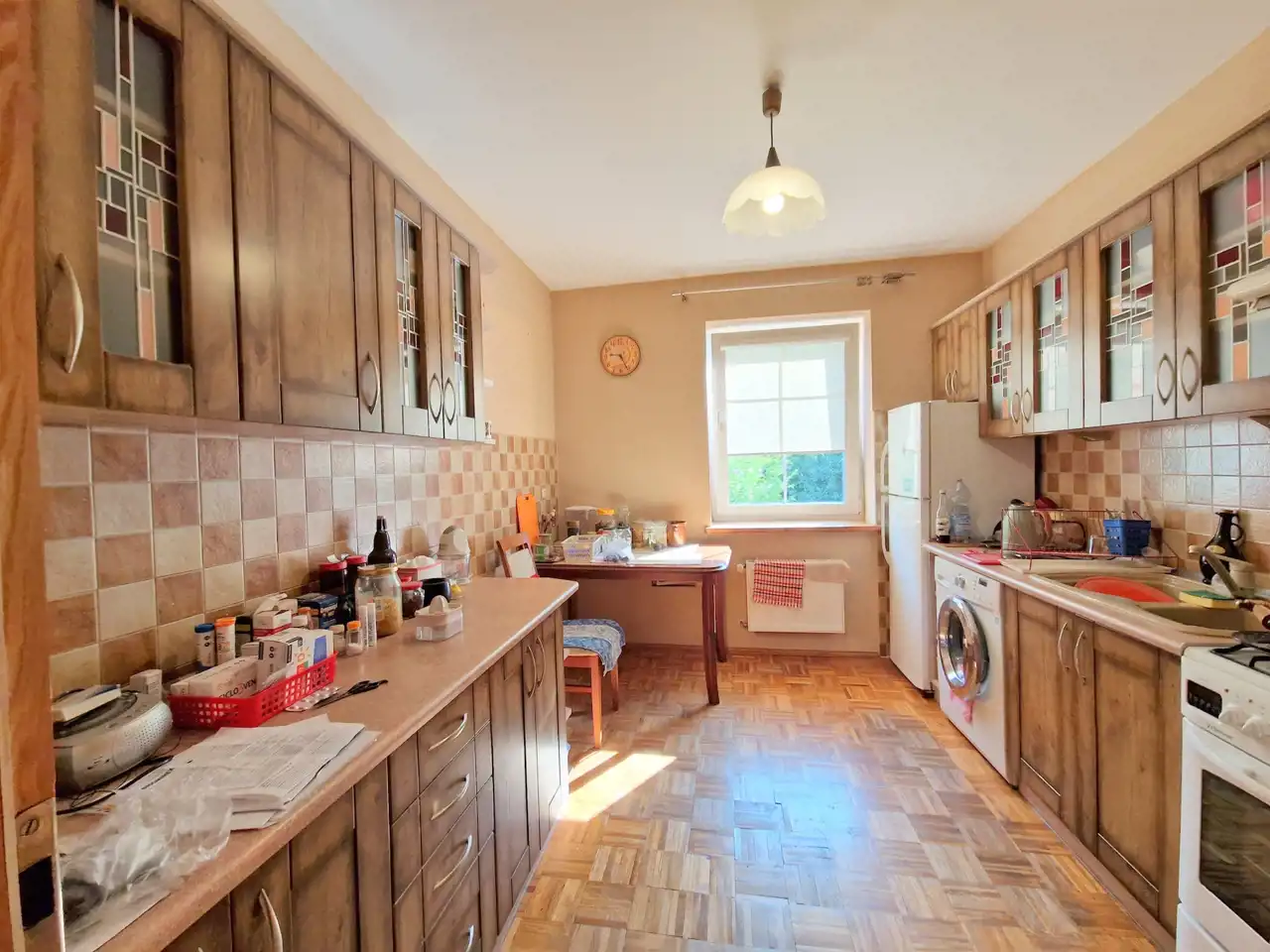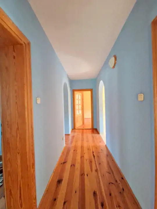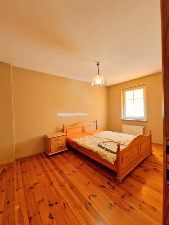 Dach pokryty dachówką karpiówką, podbitka drewniana, stropy drewniane, schody wewnętrzne drewniane, Okna PCV, parapety wewnętrzne drewniane a zewnętrzne klinkierowe, Na podłodze parkiet, deska oraz glazura, Ściany w gładzi, Łazienki w starszej glazurze. Drzwi i futryny wewnętrzne drewniane.