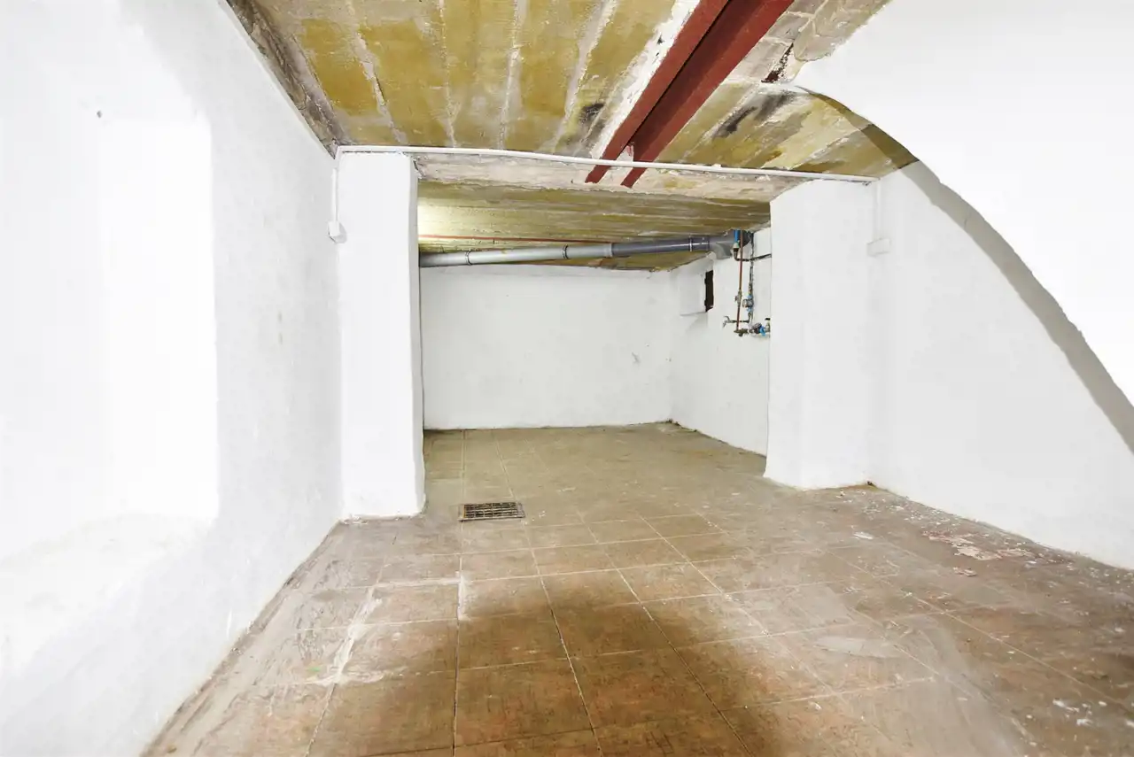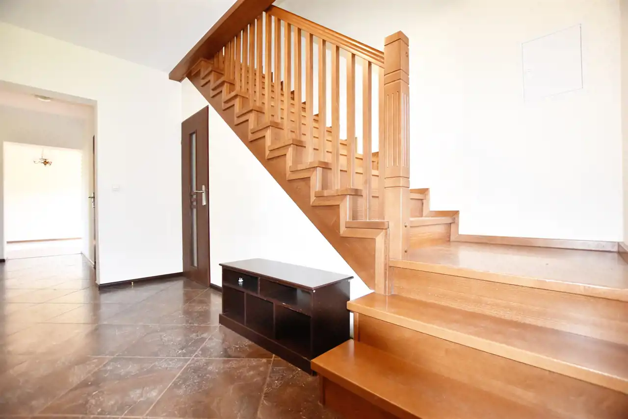 widny korytarz z klatką schodową - wejście na piętro (schody jesionowe w bardzo dobrym stanie) oraz z zejściem do piwnicy. Piwnica z oknem z kratą, na podłodze płytki;