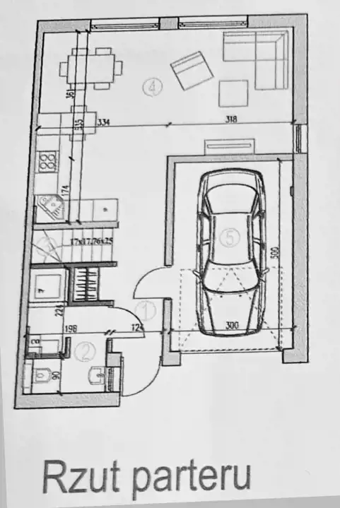 Na poziomie parteru rozmieszczono salon z aneksem kuchennym z wyjściem na ogród, WC, wiatrołap,