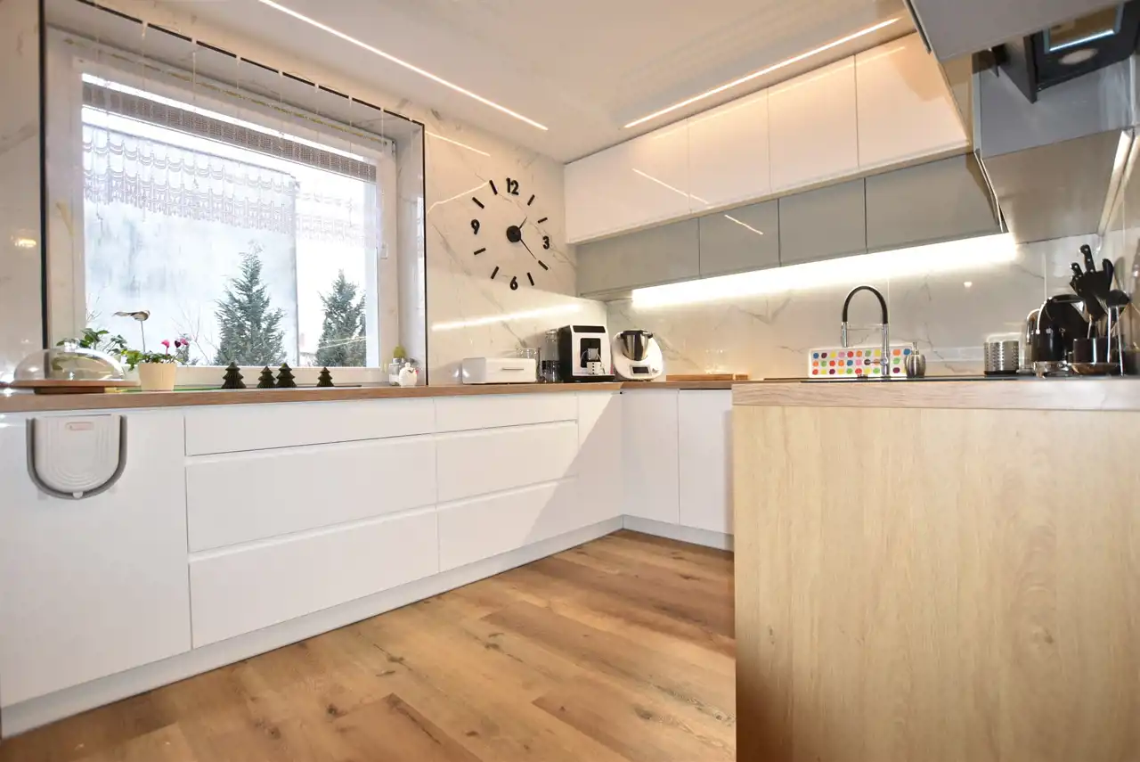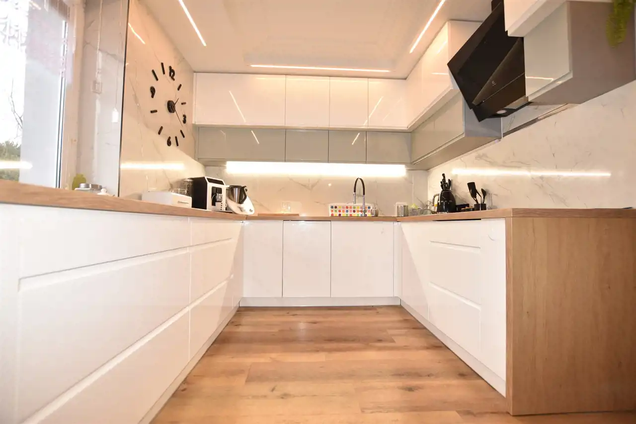 kuchnia (15 m.kw) umeblowana na wymiar ze sprzętem AGD z 2022r: płyta indukcyjna, piekarnik elektryczny, okap, zmywarka 45 cm, mikrofalówka