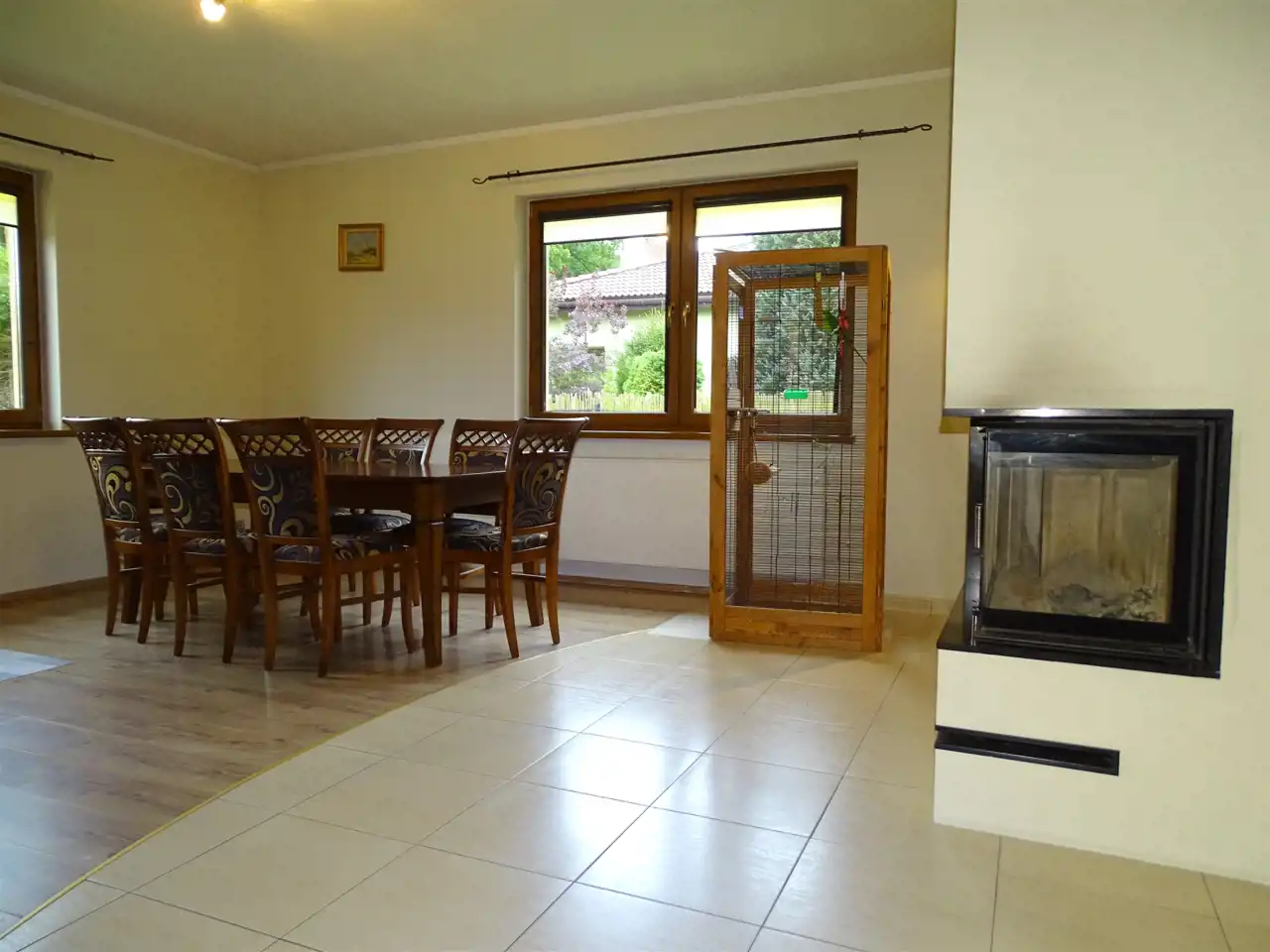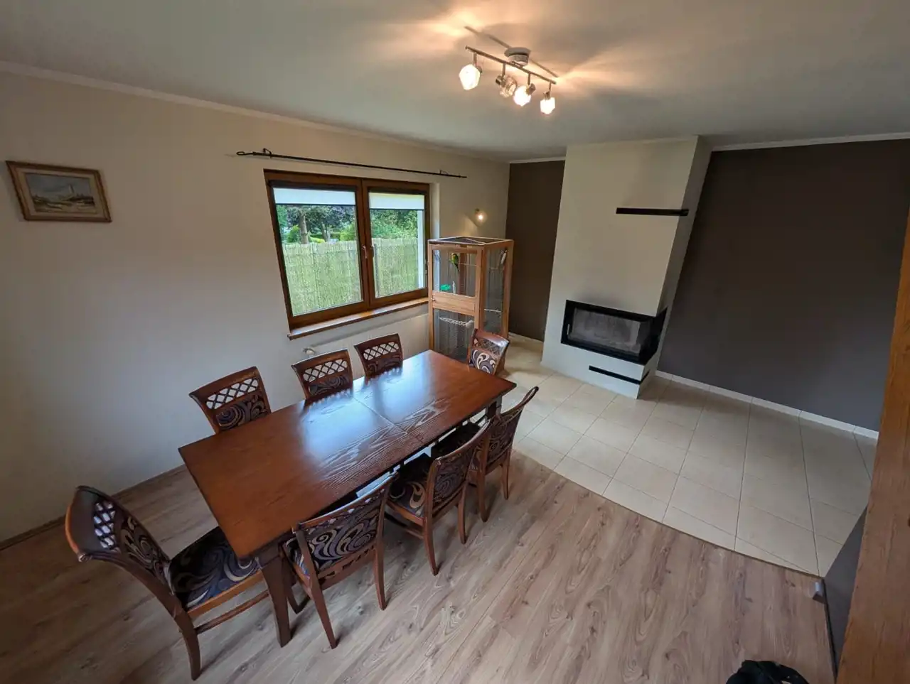 - jadalnią i kominkiem panoramicznym i pompą rozprowadzającą ciepło,